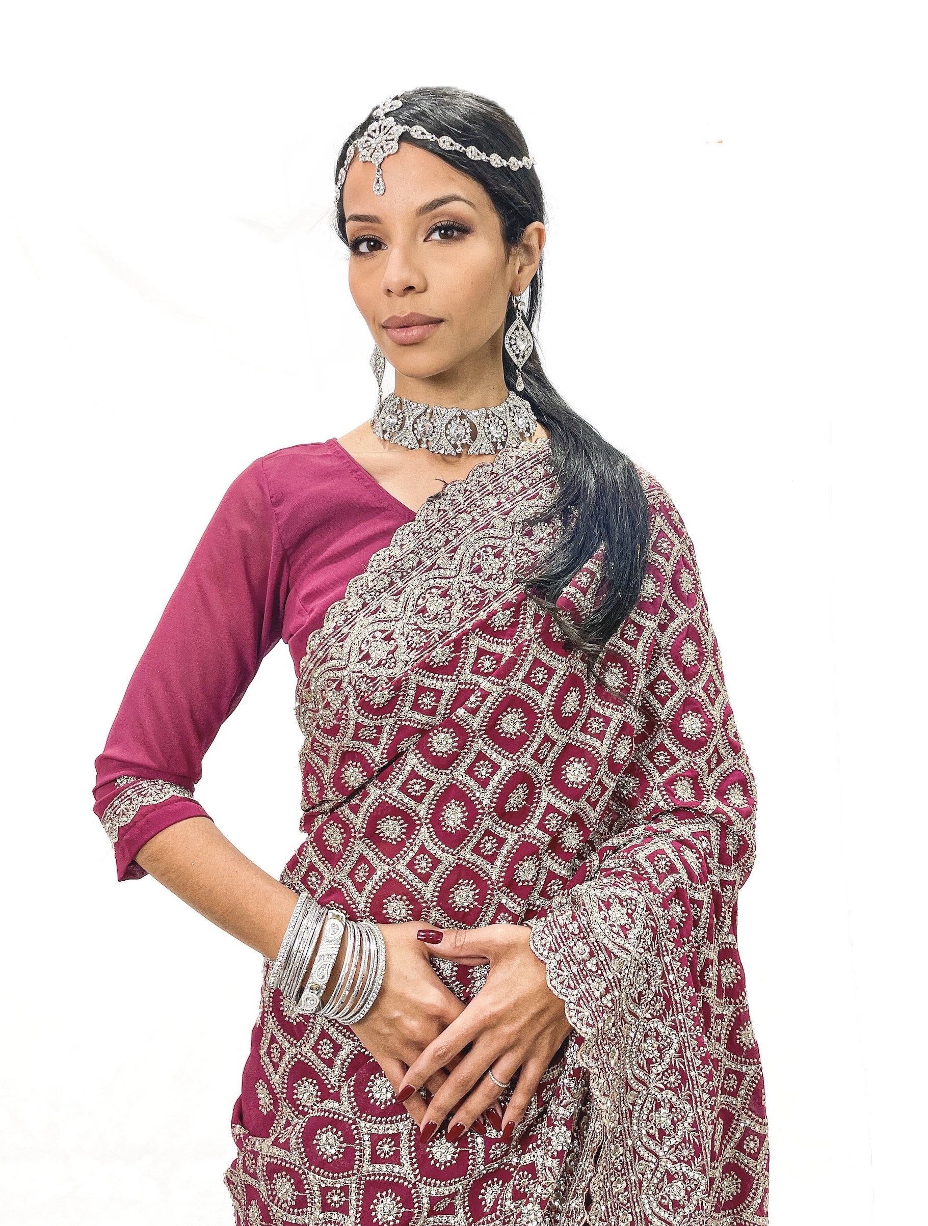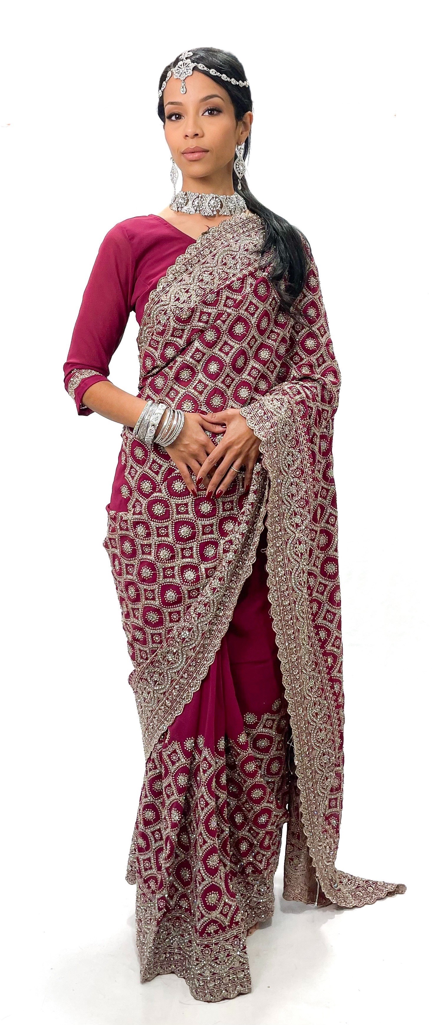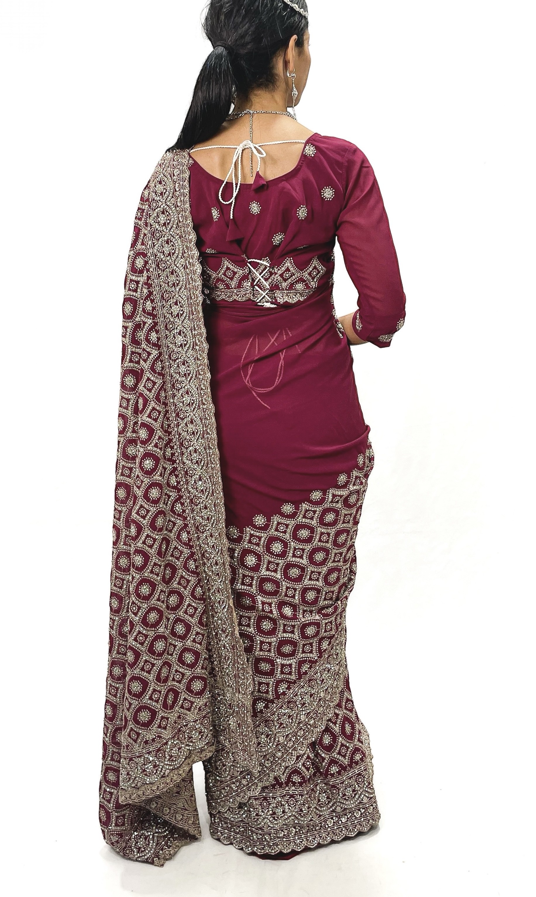 Éblouissant sari indien prêt-à-porter, sublimé par un somptueux travail de sequins, perles et strass scintillants.