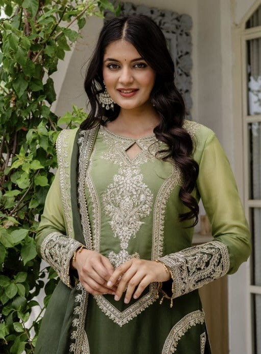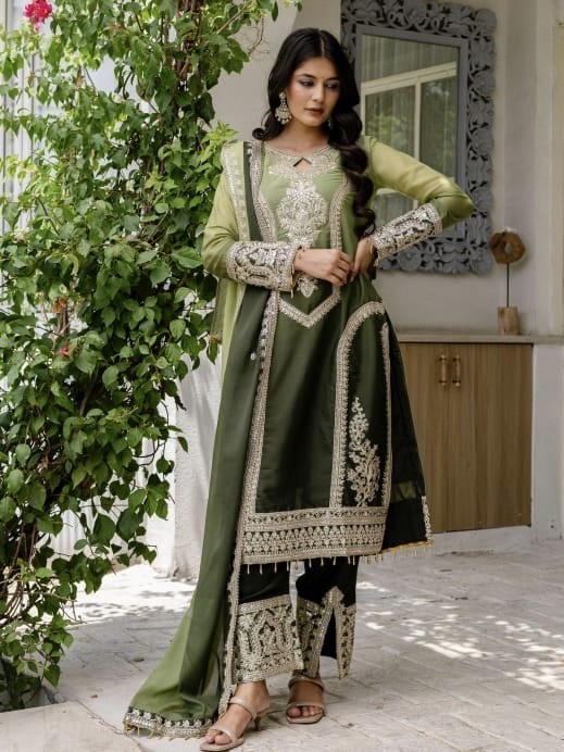 Apportez une touche royale à votre garde-robe avec ce Salwar Kameez 3 pièces brodé à la fois raffiné et confortable. Confectionné dans un tissu fluide et satiné, cet ensemble se distingue par sa broderie dorée artisanale soigneusement travaillée sur le devant, les manches et le pantalon.