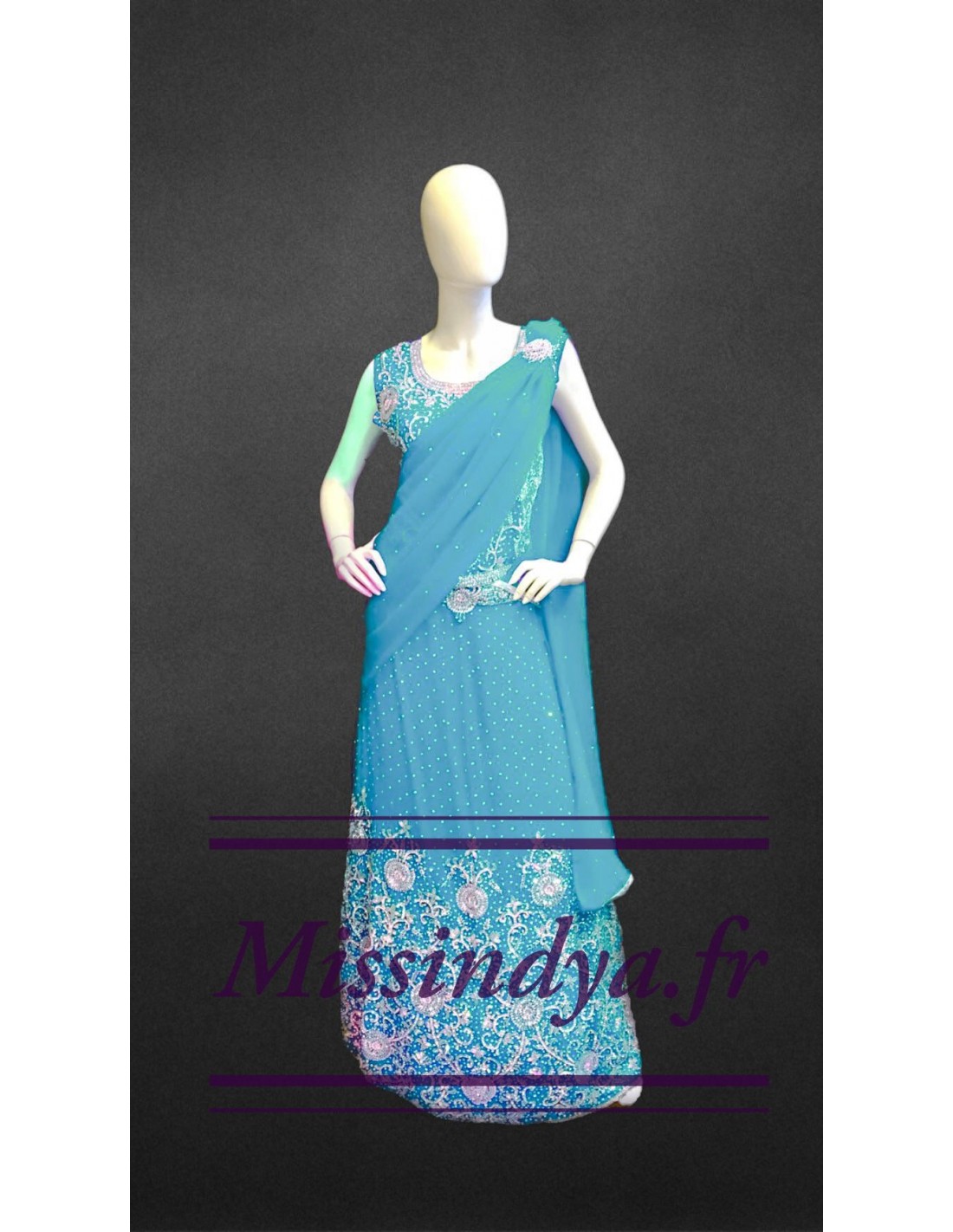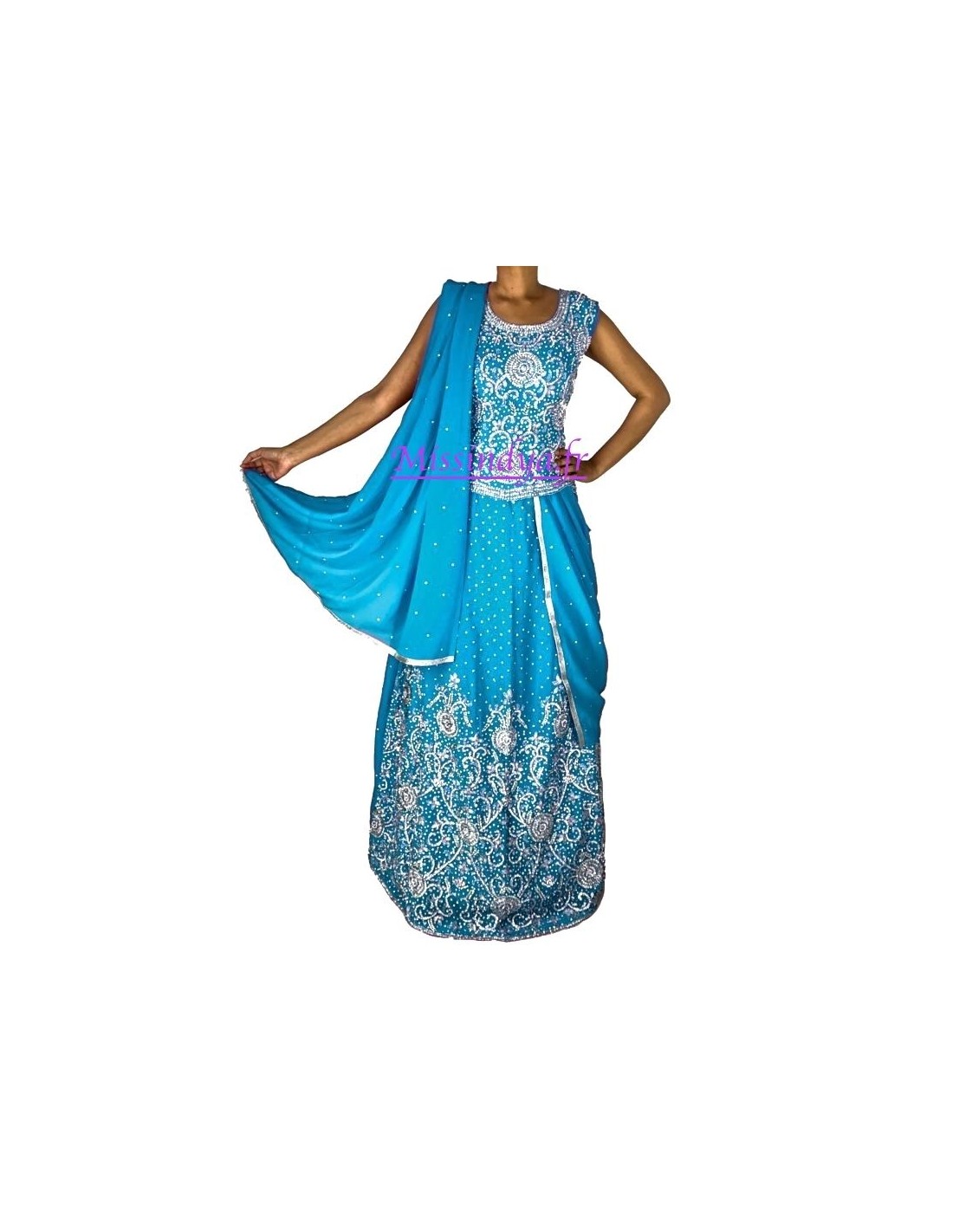 lehanga précieusement brodé et perlé de strass argenté, cette tenue très élégante et raffinée, vous sublimera telle une princesse indienne!
