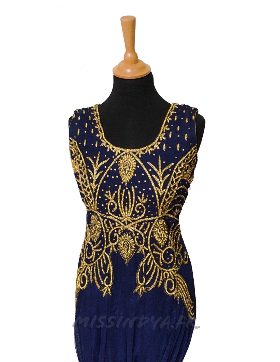 Robe de soirée indienne bleu marine entierement perlée de pierres sur le décolté et aux niveaux de la taille.