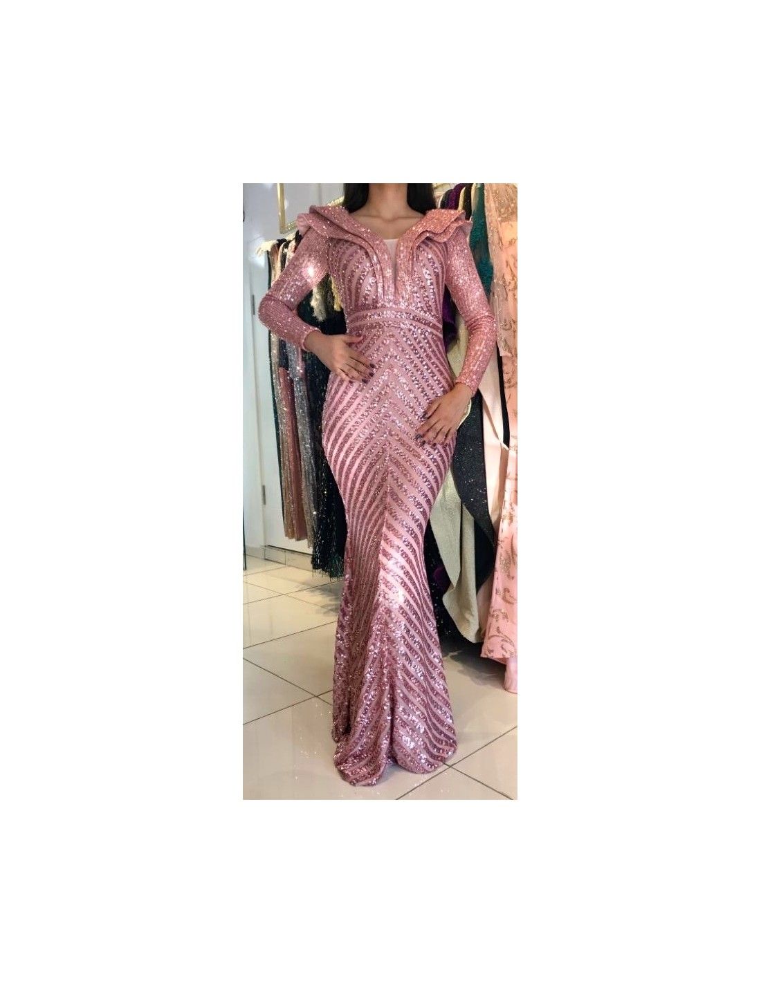 Robe de soirée entièrement sertie de sequins manches longues bouffantes