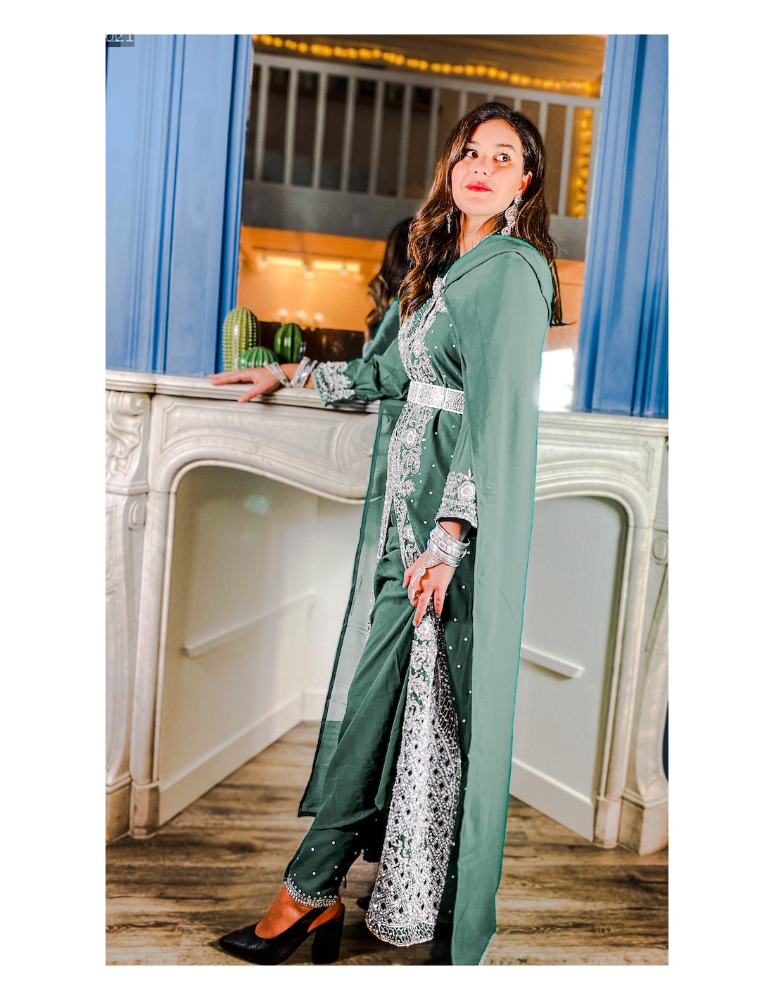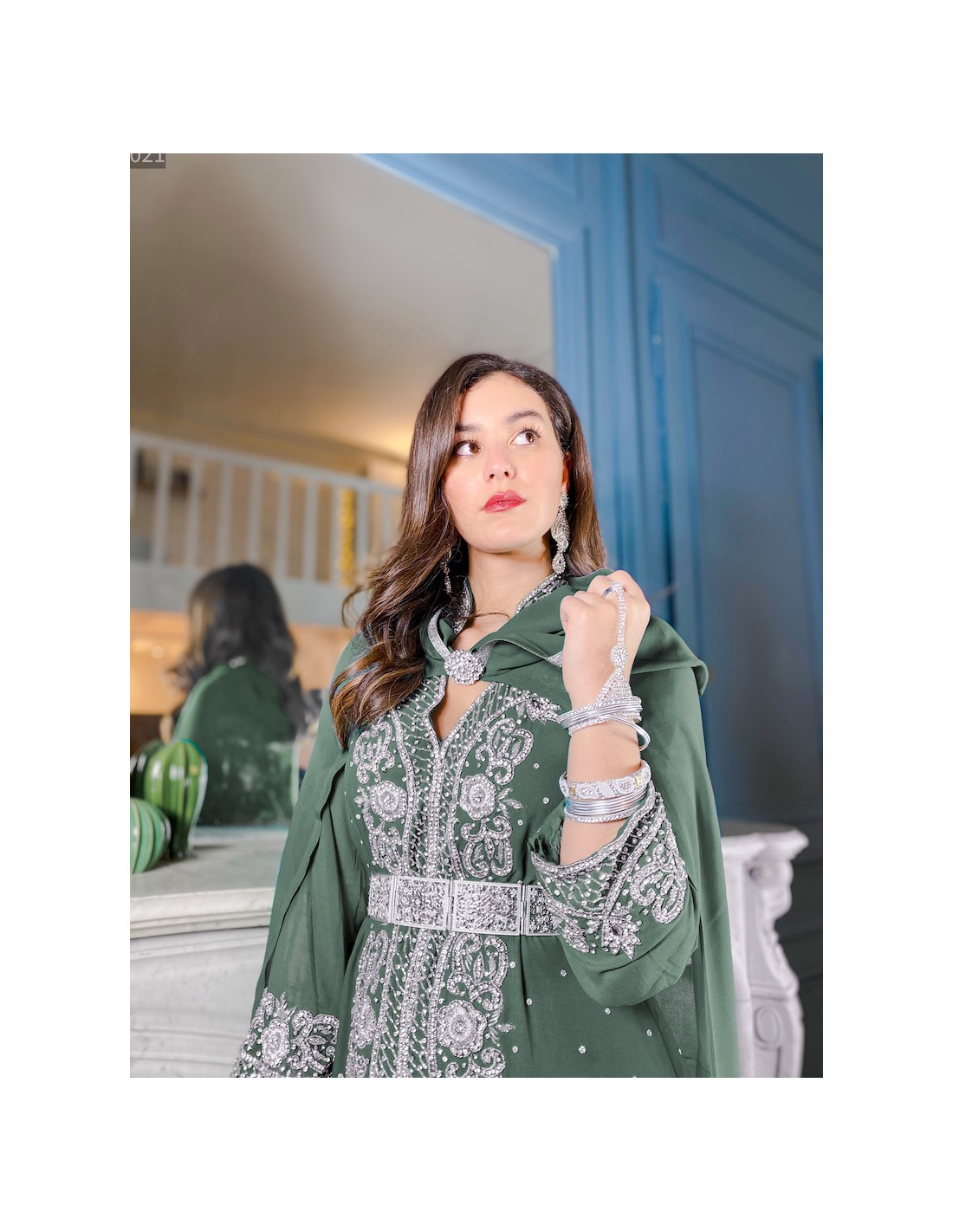 Robe de soirée indienne en mousseline(synthétique) vert kaki, entièrement perlée de pierres sur le décolleté et sur toute la longueur de la robe, ainsi qu'un motif ornée de strass argenté au dos de la robe.