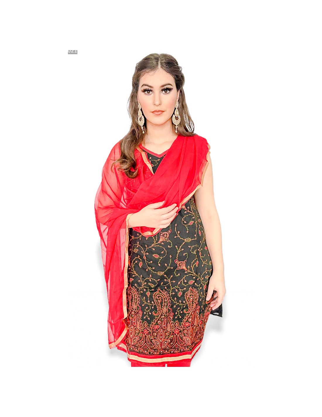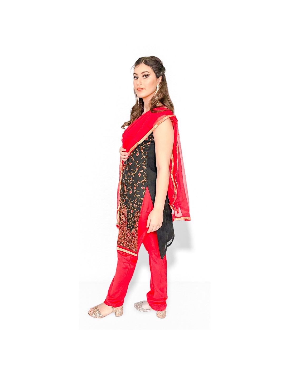 Salwar Kameez rouge, noir et dorée comprenant: tunique,pantalon,chale