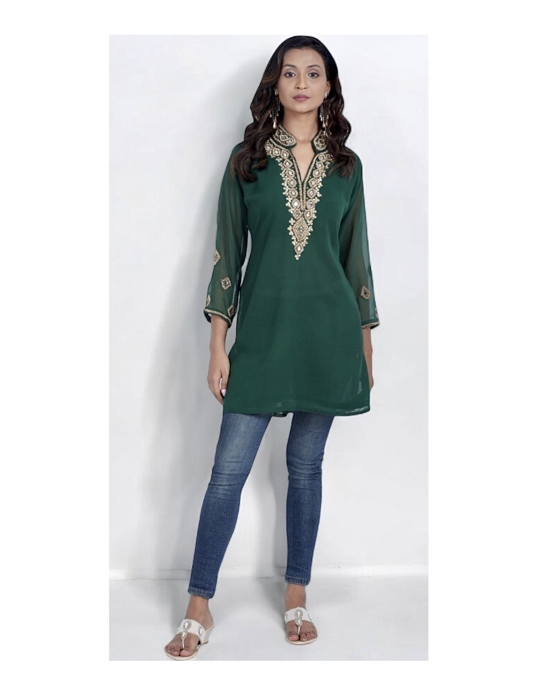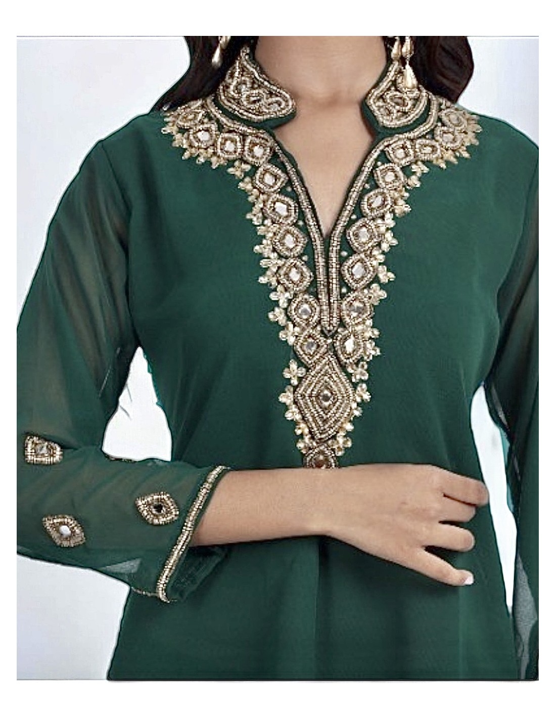 Il s'agit d'une belle longue tunique noire en mousseline de soie indienne Kurti avec un beau travail de pierre autour de l'encolure.