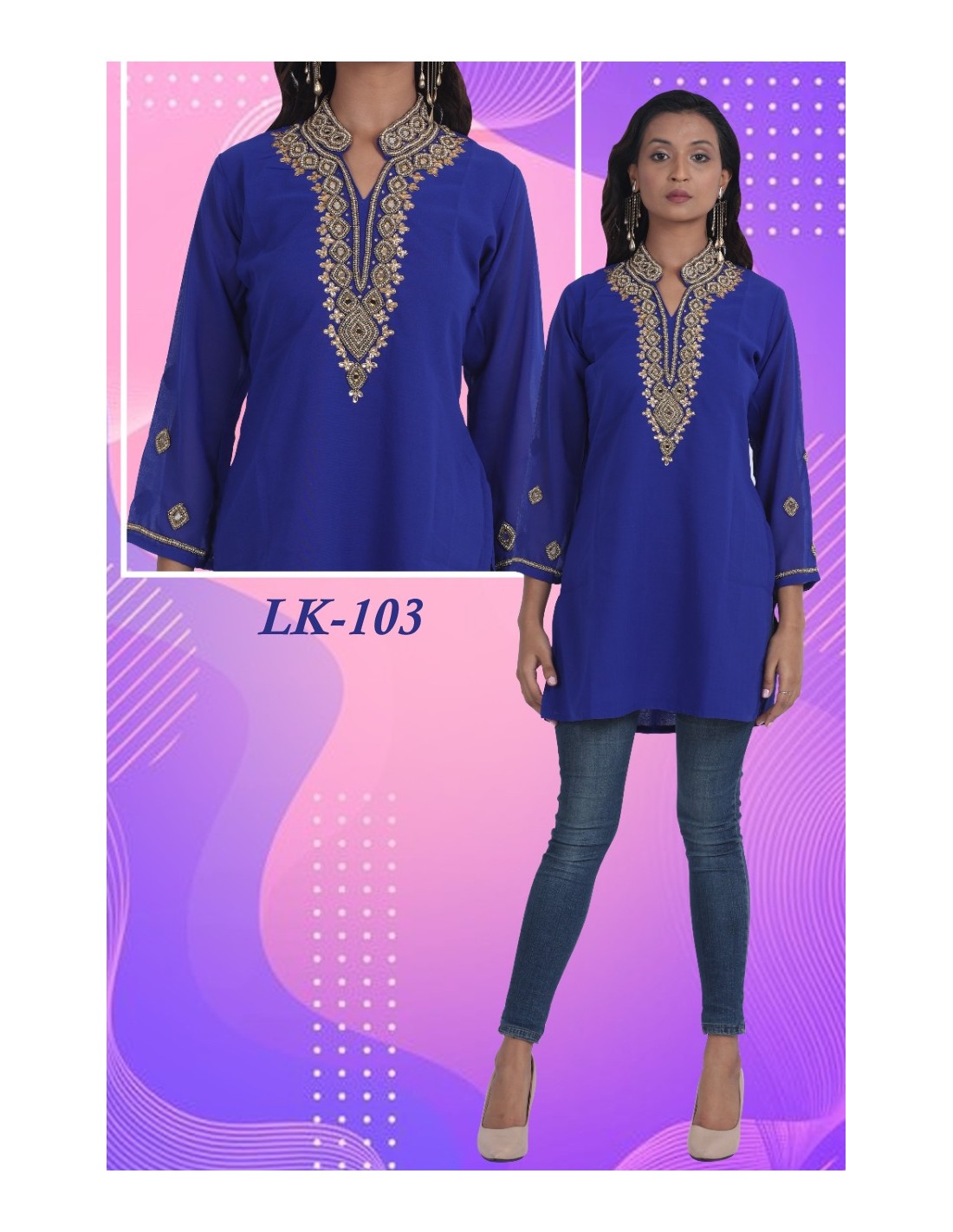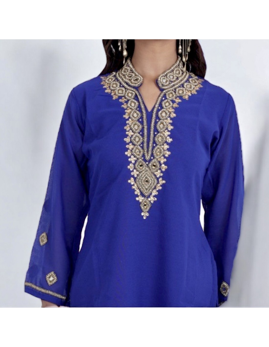 Tunique kurti indienne ethnique perlé Bleu et doré MY22  - 1