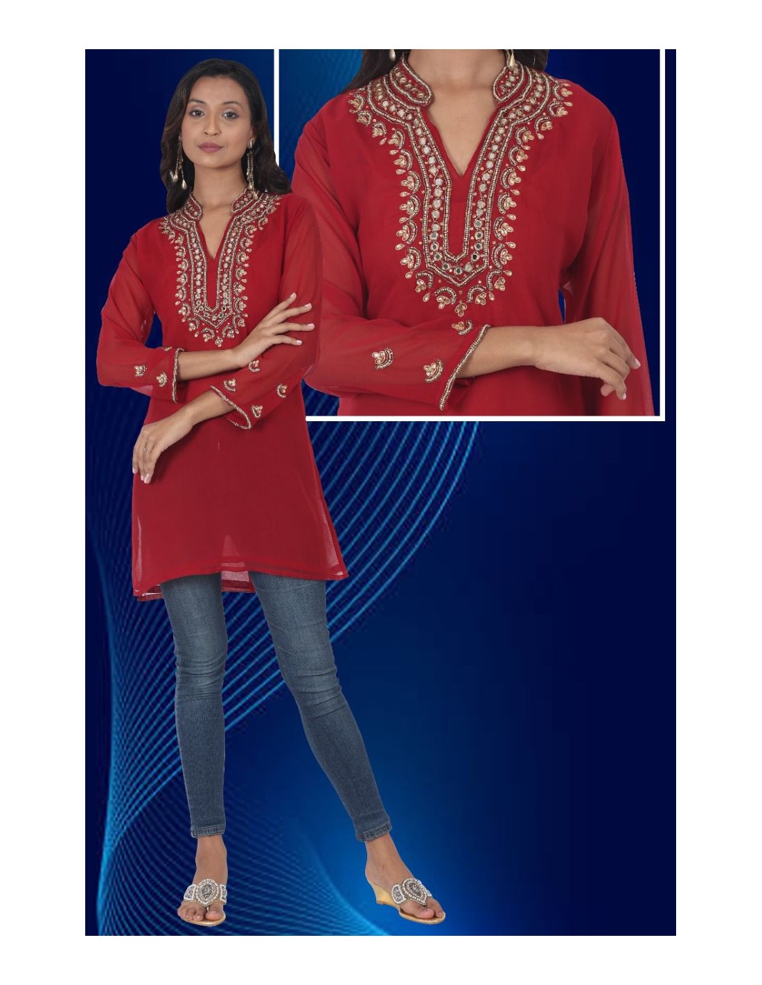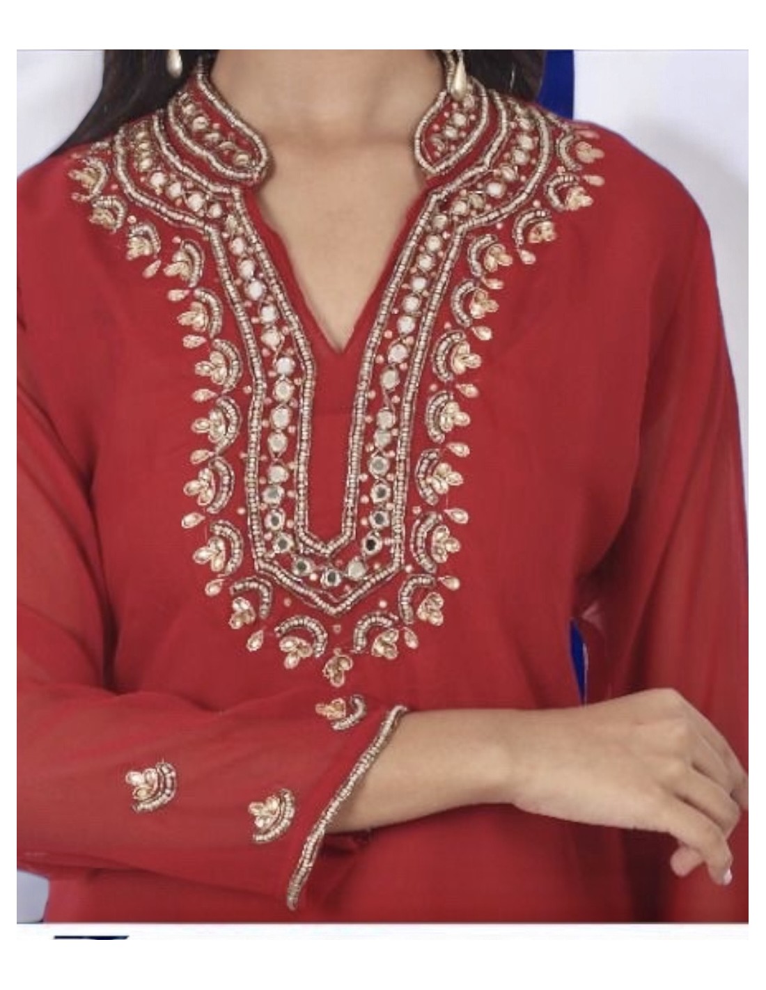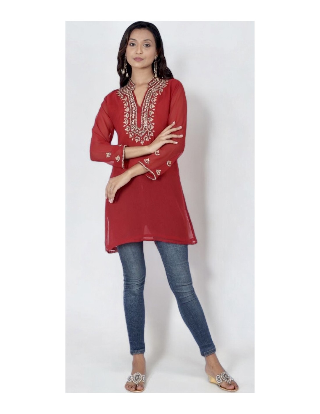 belle longue tunique en mousseline indienne, avec un beau travail de broderies pierre et strass autour de l'encolure et des manches