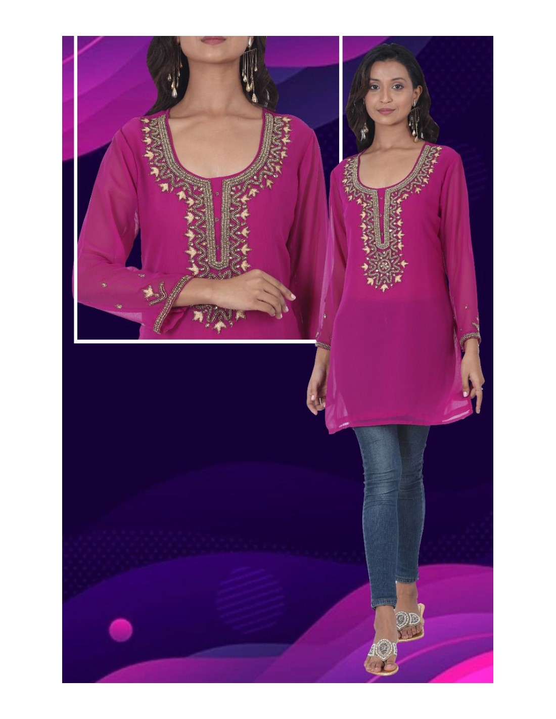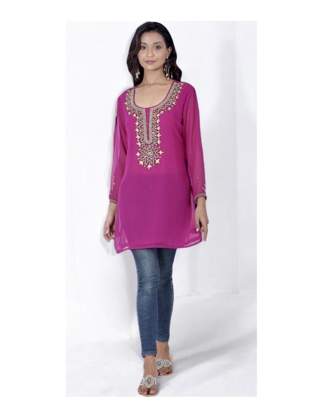 belle longue tunique en mousseline indienne, avec un beau travail de broderies pierre et strass autour de l'encolure et des manches