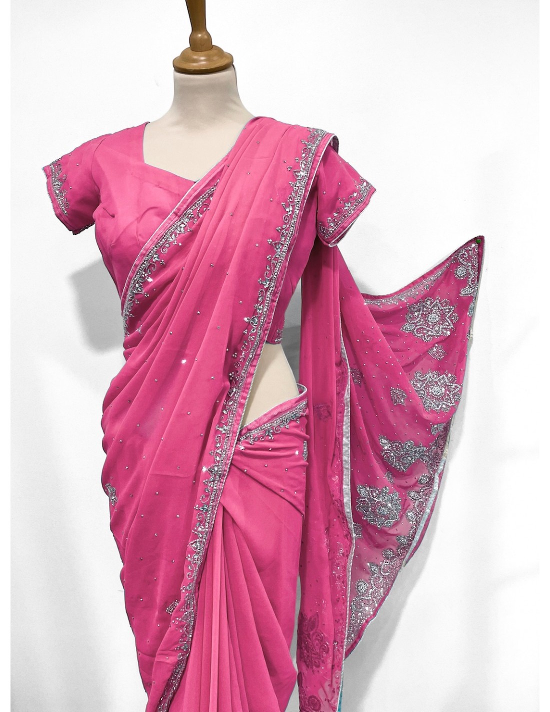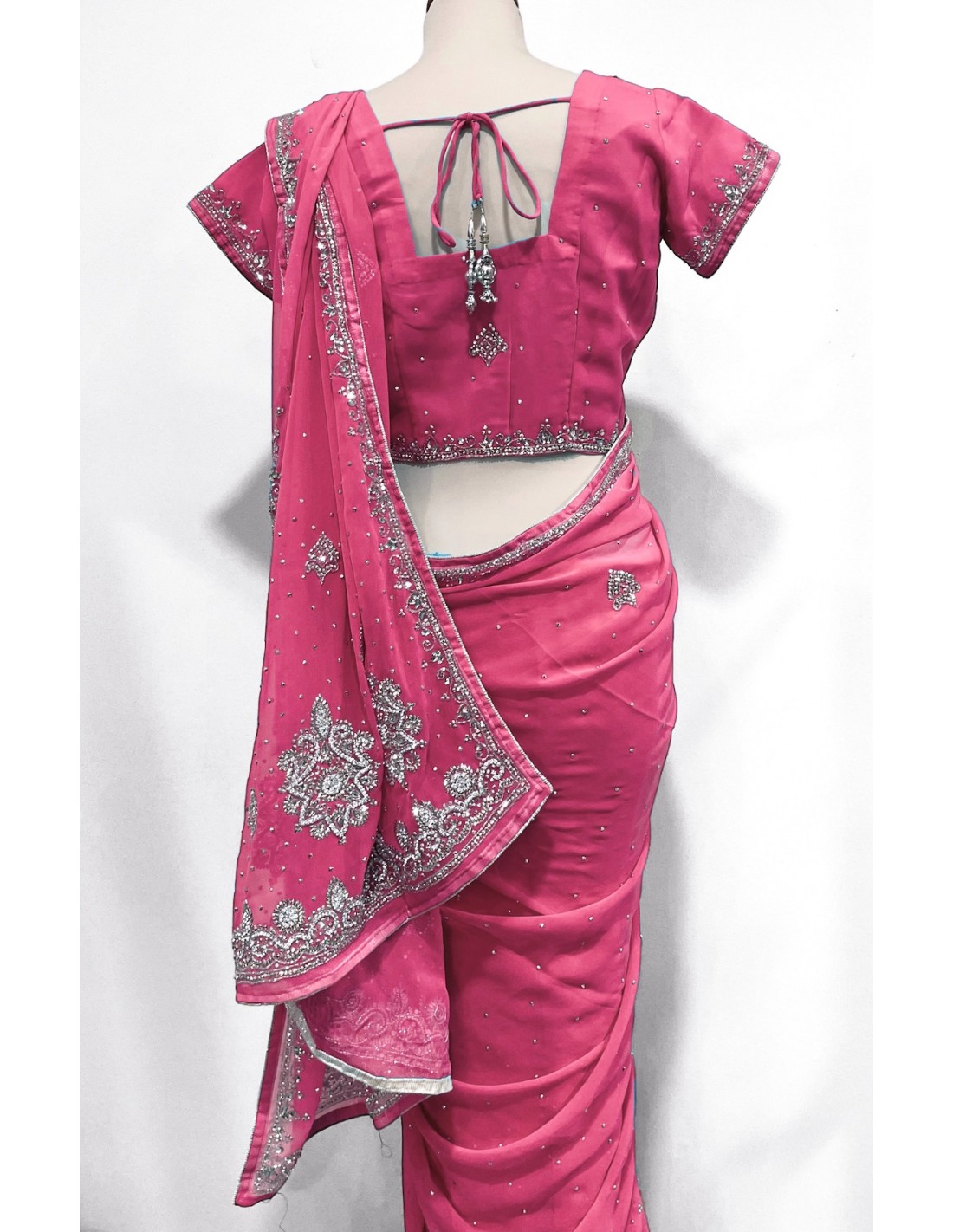 Sari sertie de pierre argenté et strass sur le top, et le tissu.