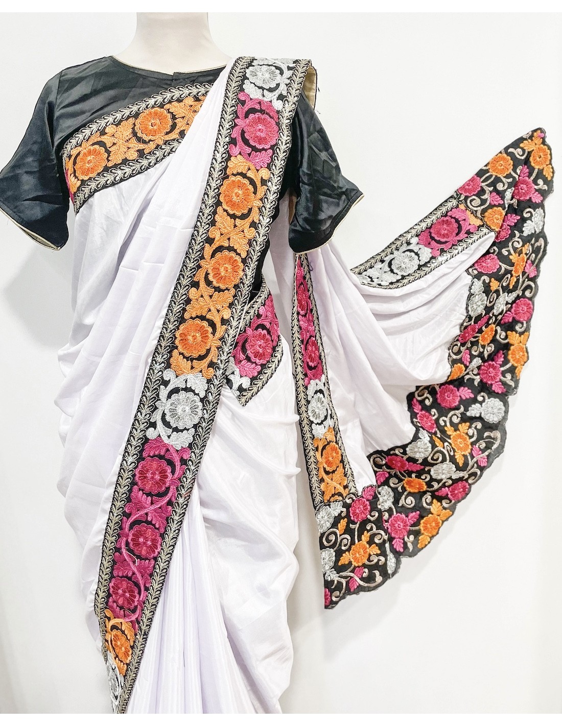 tissus en coton soyeux blanc, brodé d'un large bord aux motifs fleuries.