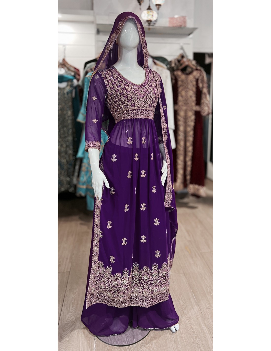 Tenue salwar kameez d'inspiration pakistanaise, richement brodé et travaillé avec de petit strass argenté