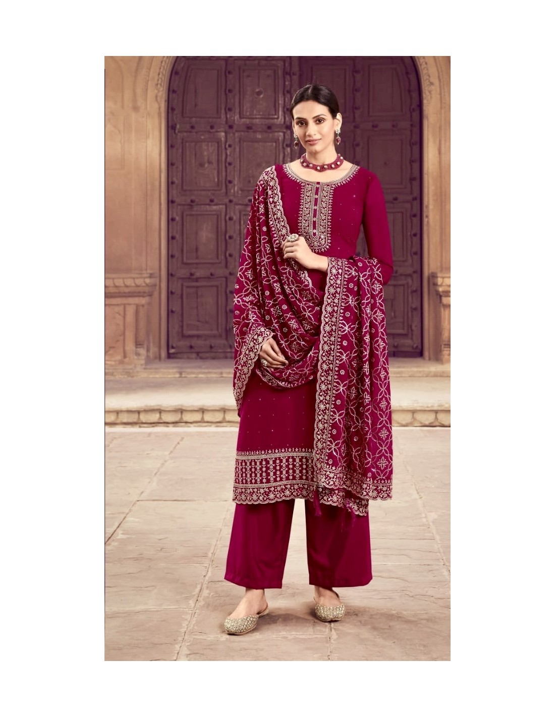Apportez une touche de sophistication à votre garde-robe avec cet élégant ensemble salwar kameez en teinte cerise profonde, orné de broderies argentées exquises. Composé d'une tunique droite à manches longues, d'un pantalon fluide et d'une étole (dupatta) richement décorée de motifs traditionnels, cet ensemble est parfait pour les mariagescérémonies, et autres occasions festives.