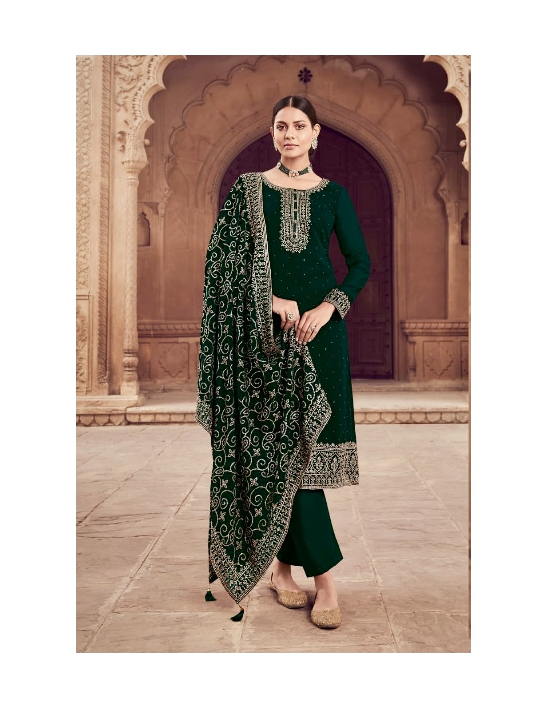 Faites une entrée majestueuse avec cet élégant ensemble salwar kameez vert émeraude, sublimé par des broderies dorées raffinées. La tunique droite ornée de détails exquis, le pantalon assorti et la somptueuse étole (dupatta) richement décorée avec des motifs traditionnels apportent une allure royale à cet ensemble.