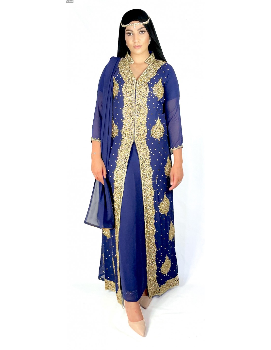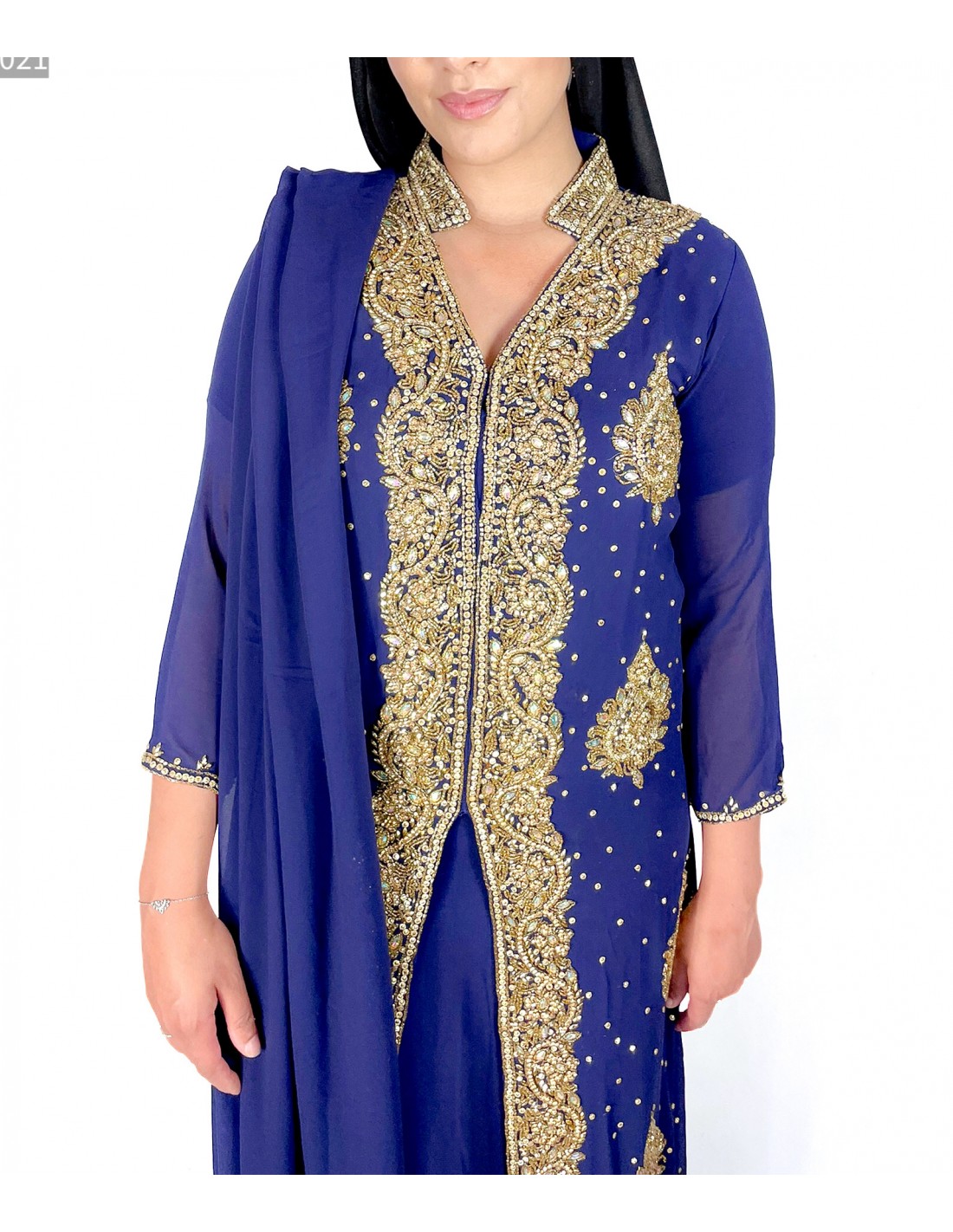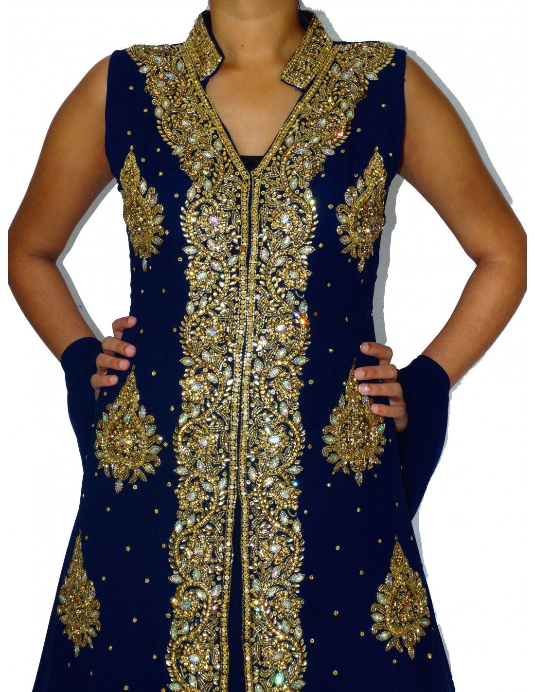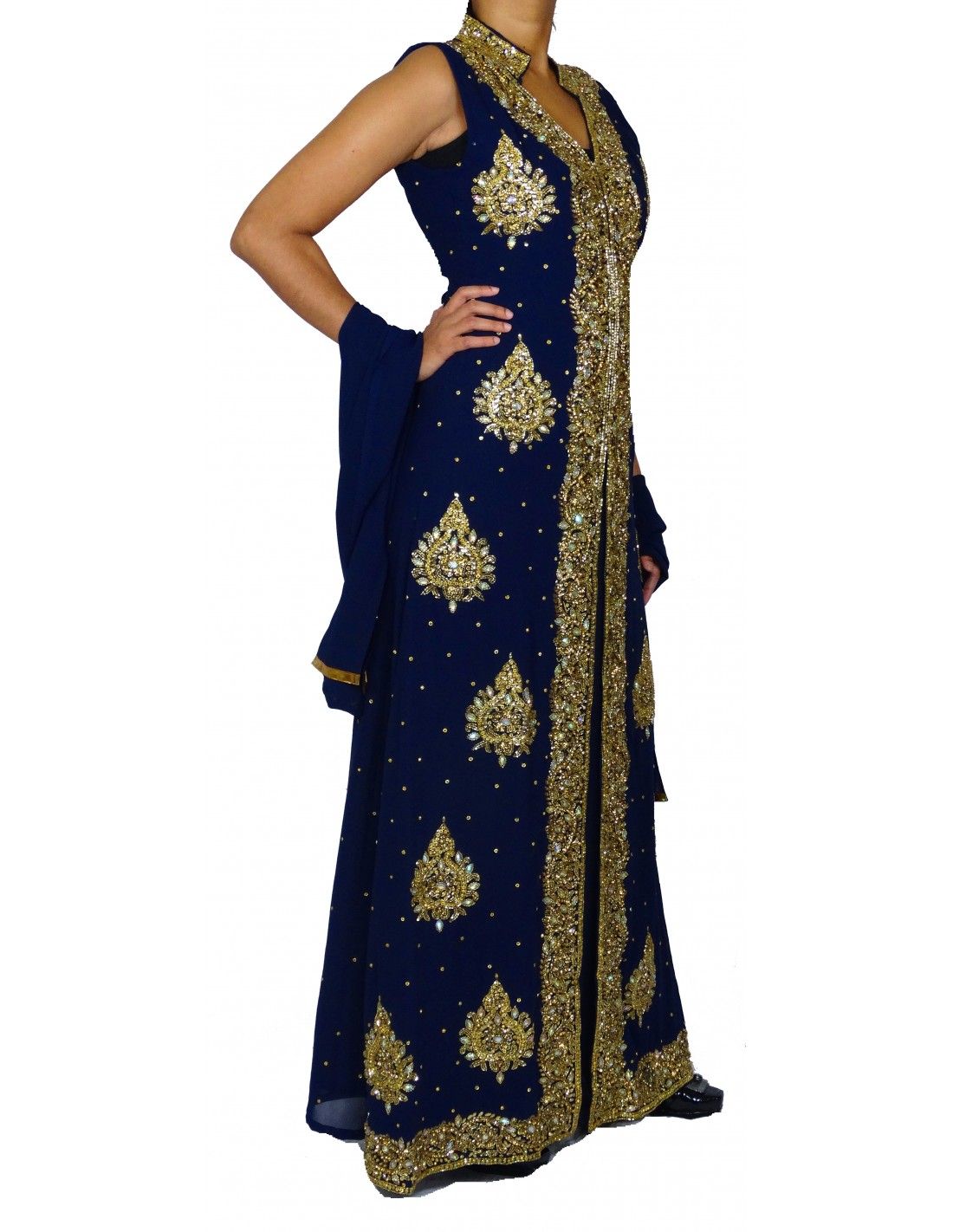 Robe indienne de soirée richement perlé de couleur bleu marine & doré