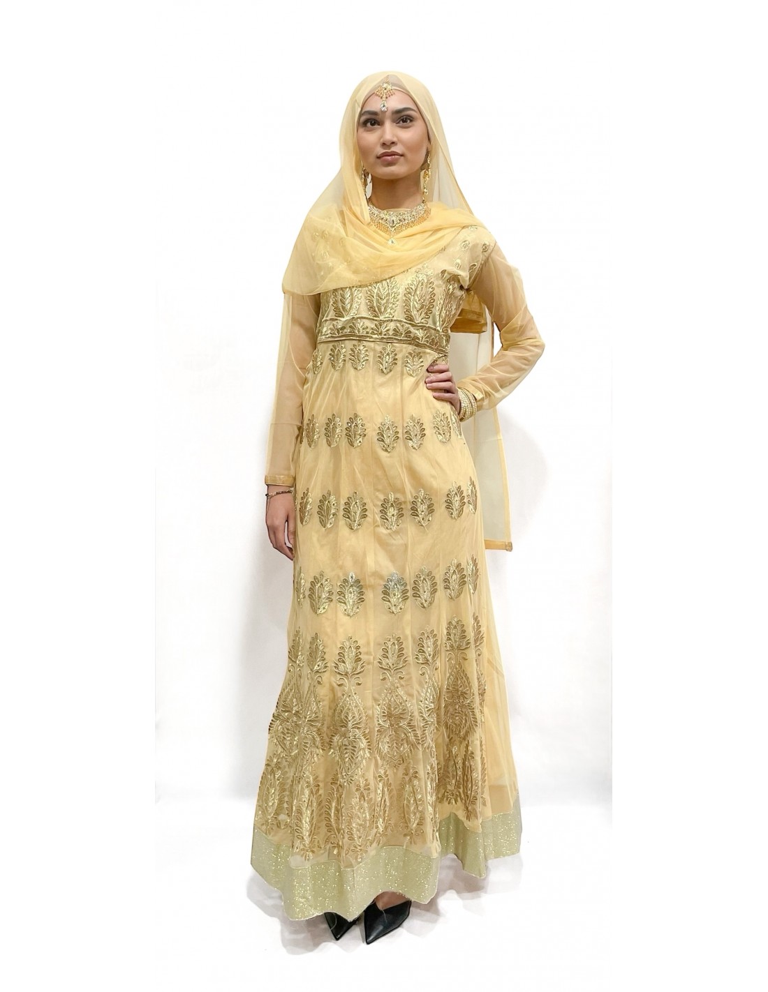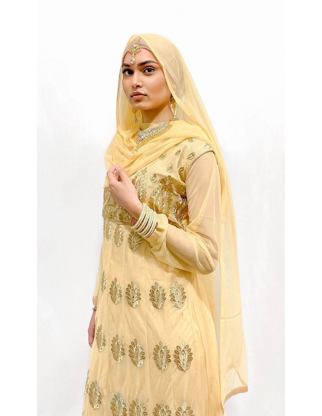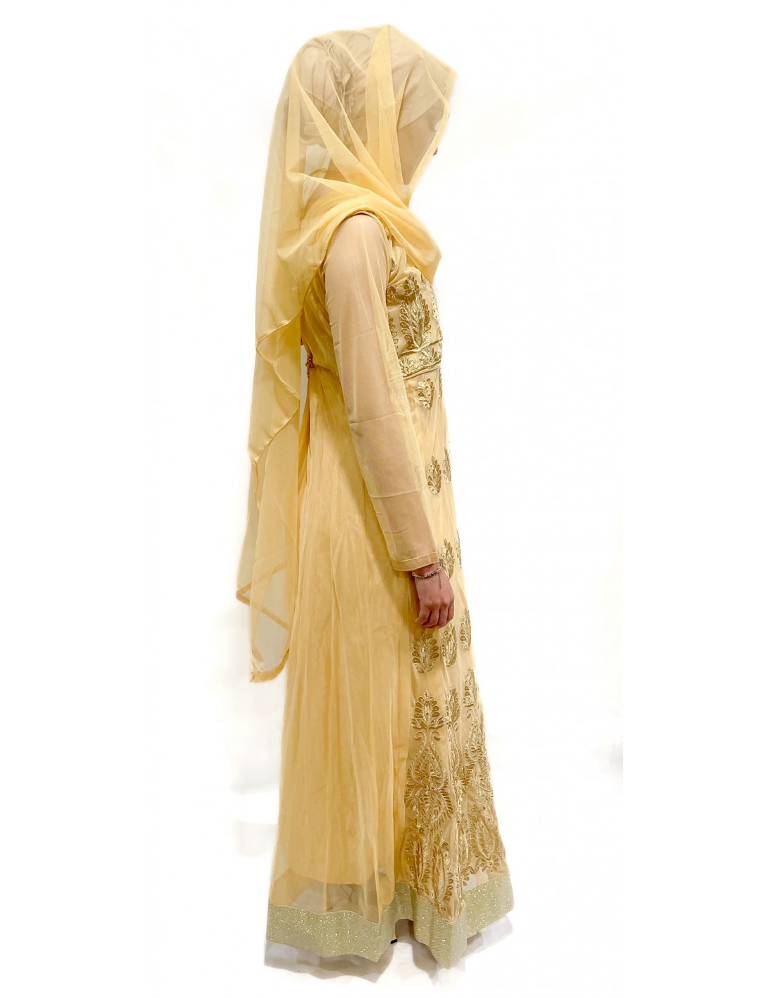 la tenue est aussi assortie d'une longue étole en tulle et ornée de liseré doré.