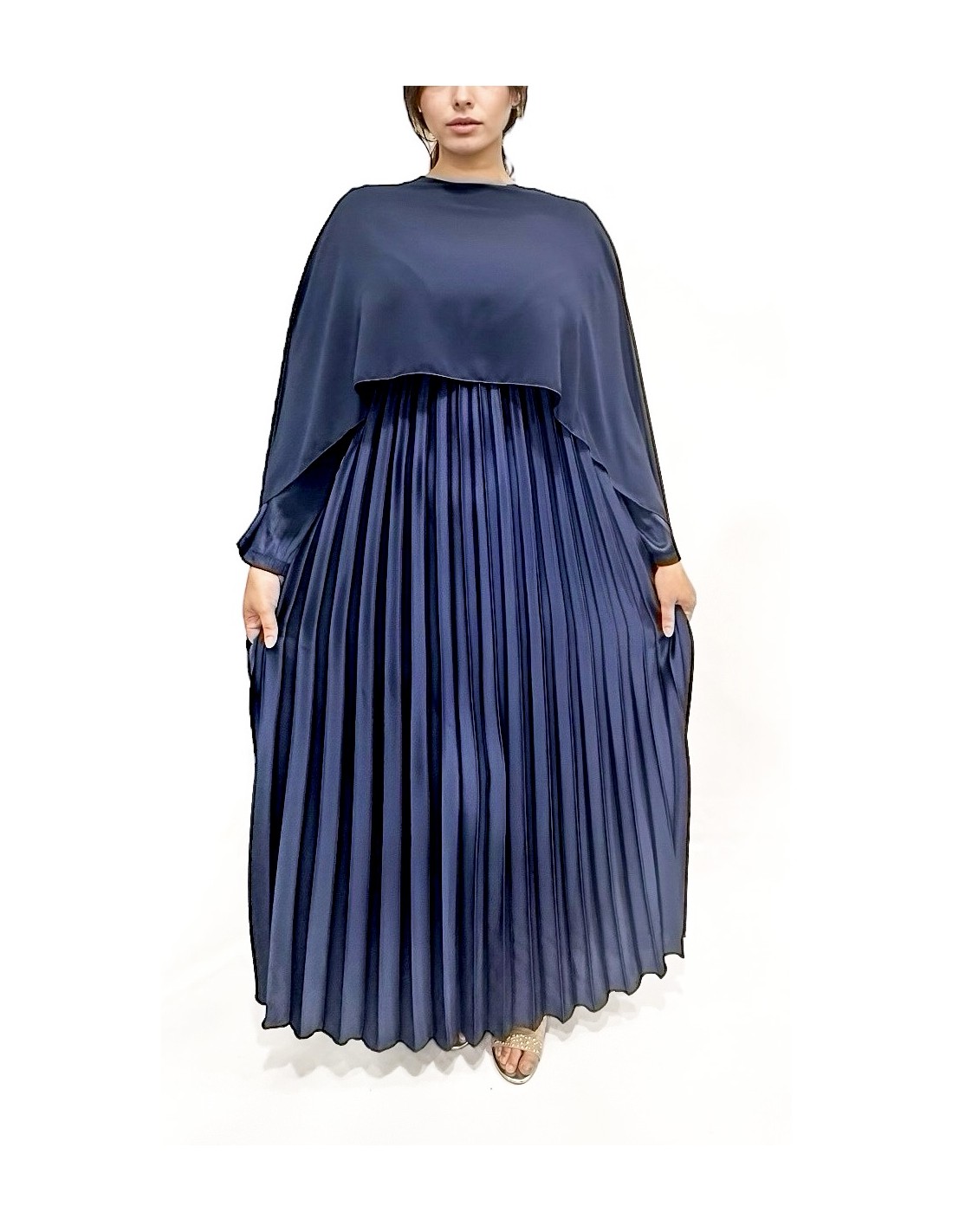 Cette somptueuse robe plissée bleu ciel, allie modernité et sophistication grâce à sa coupe fluide et aérienne, sa cape en voilage, ample,