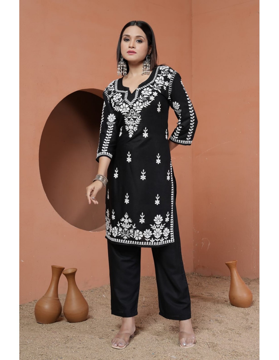 Ensemble Kurti et Pantalon Noir Brodé – Élégance et Raffinement  - 1