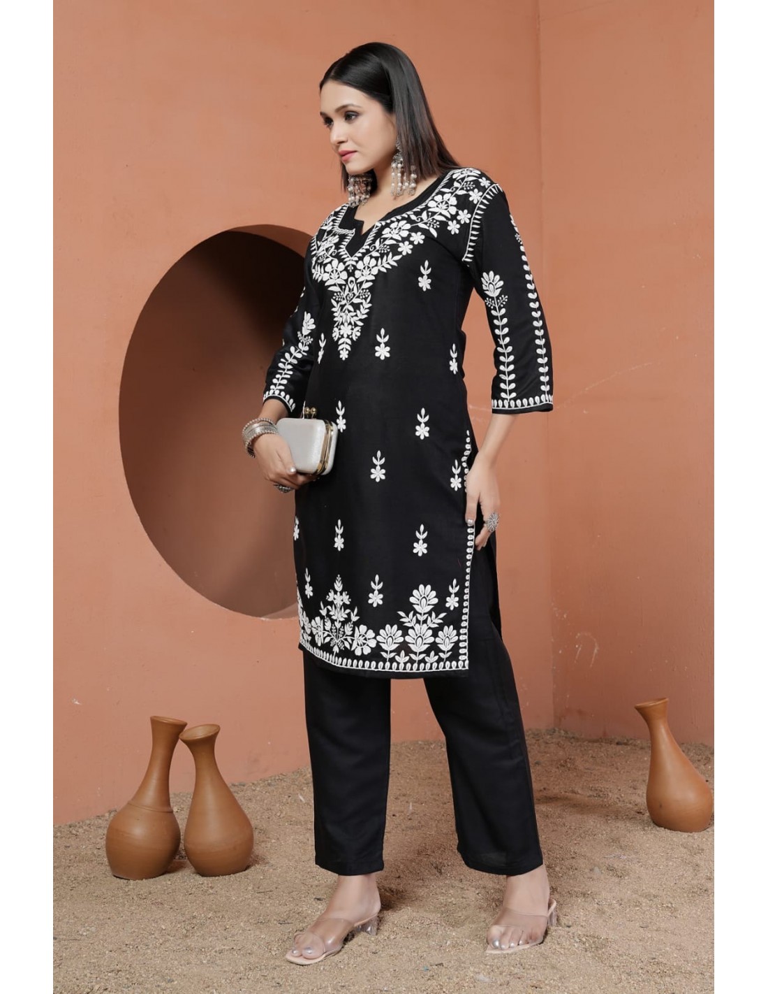 💖 Associez ce kurti noir et blanc à des accessoires argentés, des sandales élégantes ou des talons, et une pochette pour un look moderne et glamour.