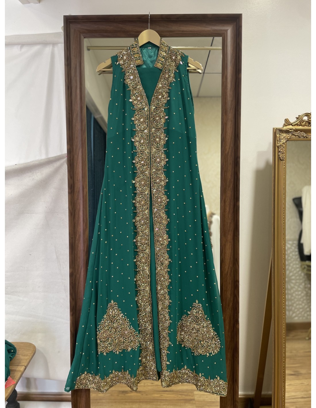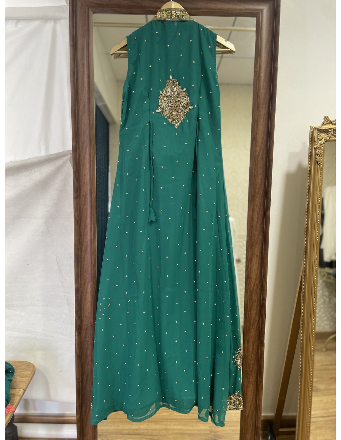 Robe de soirée indienne en mousseline(synthétique), entièrement perlée de pierres sur le décolleté et sur toute la longueur de la robe, ainsi qu'un motif ornée de strass doré au dos de la robe.