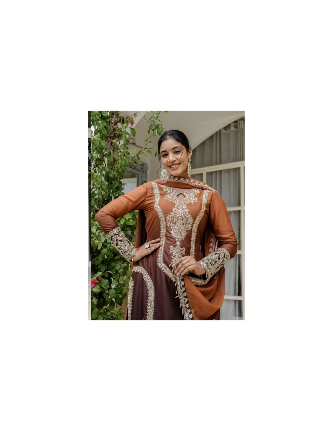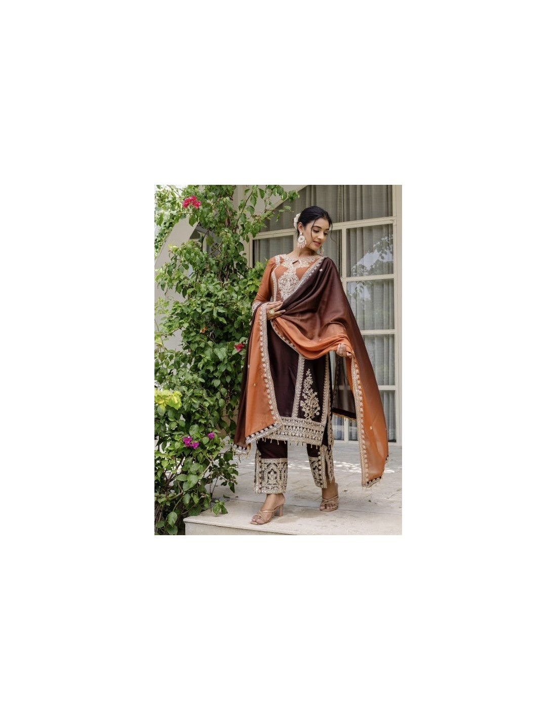 Apportez une touche royale à votre garde-robe avec ce Salwar Kameez 3 pièces brodé à la fois raffiné et confortable. Confectionné dans un tissu fluide et satiné, cet ensemble se distingue par sa broderie dorée artisanale soigneusement travaillée sur le devant, les manches et le pantalon.