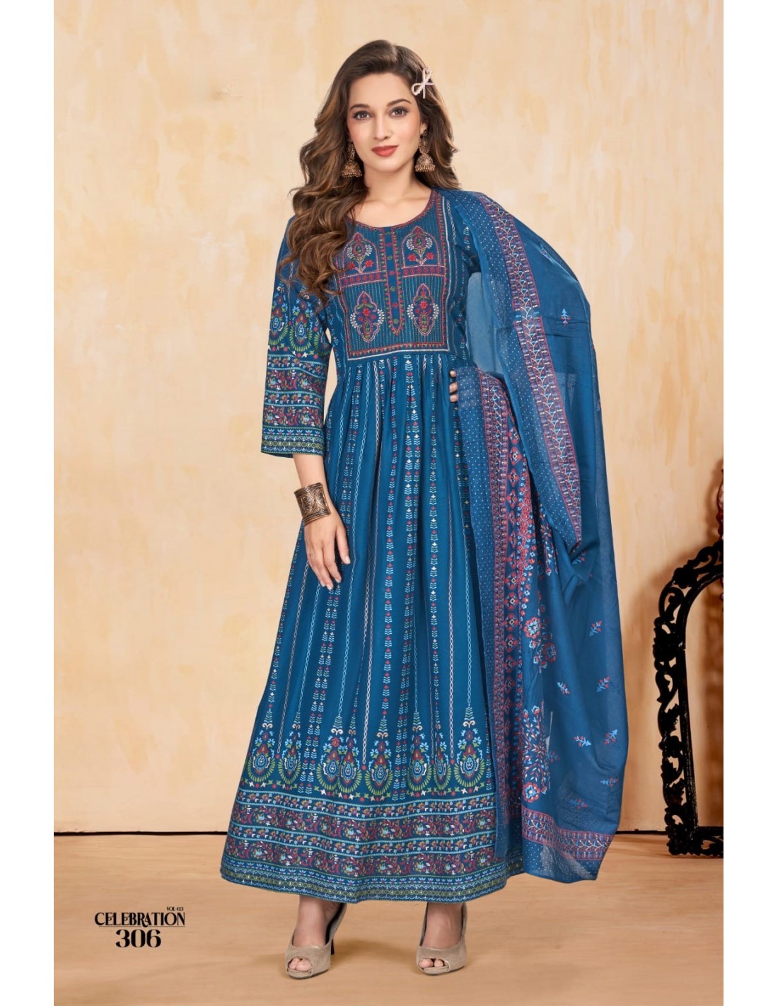 Tunique indienne Robe longue Kurti Trendy avec étole bleu  - 1