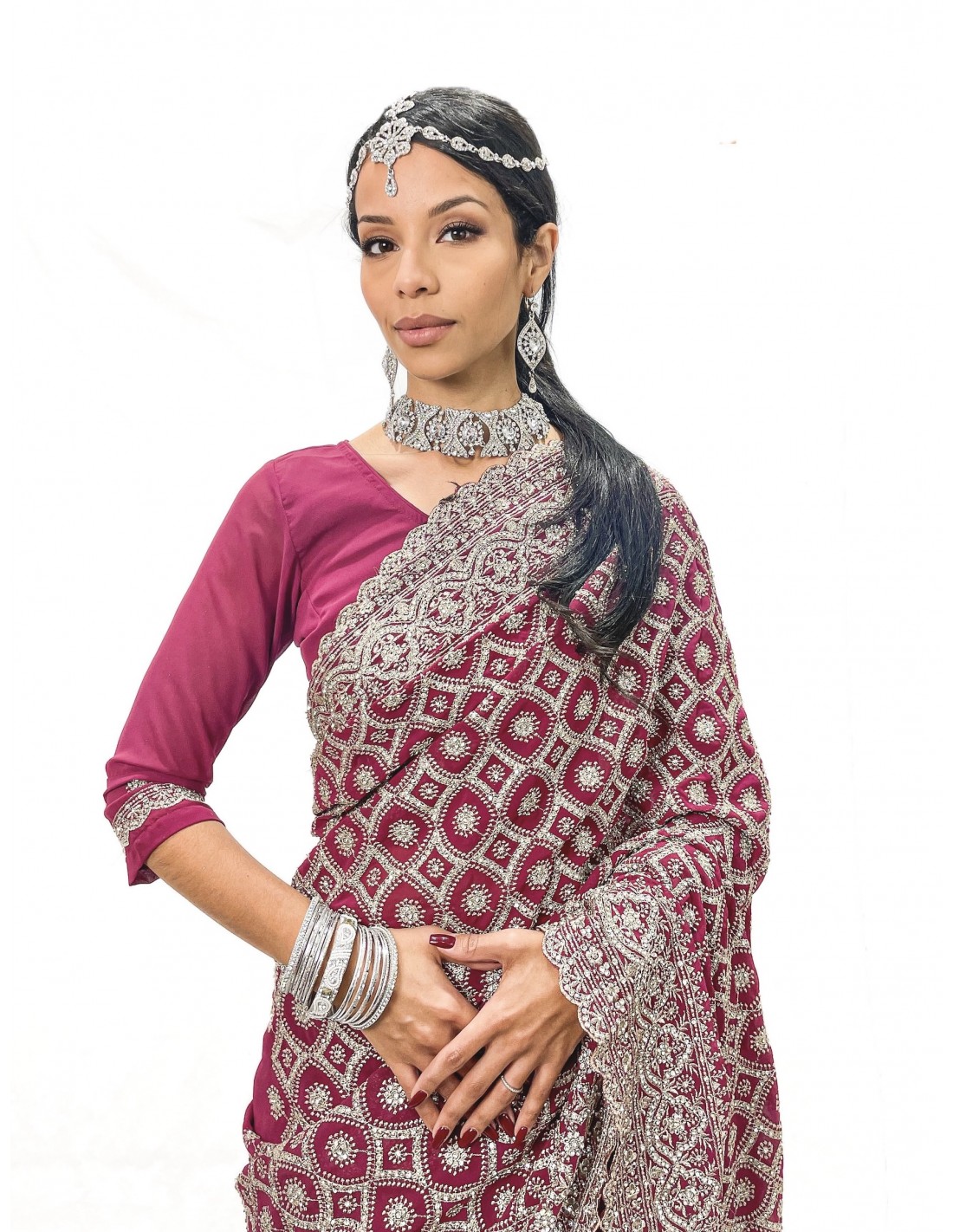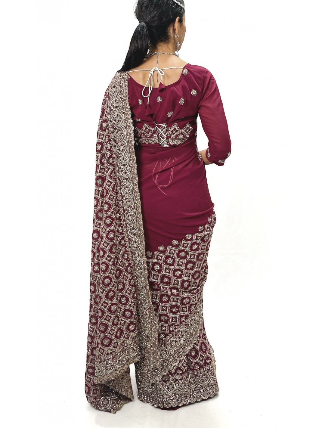 Éblouissant sari indien prêt-à-porter, sublimé par un somptueux travail de sequins, perles et strass scintillants.