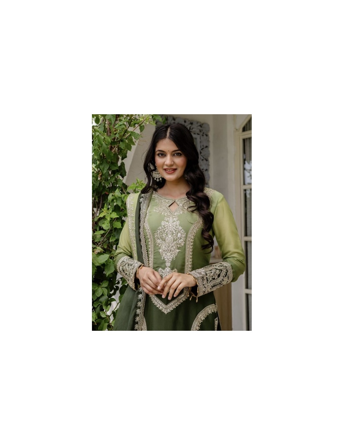 Salwar Kameez 3 pièces brodé - Tenue traditionnelle élégante Anarkali Vert olive et pistache  - 3