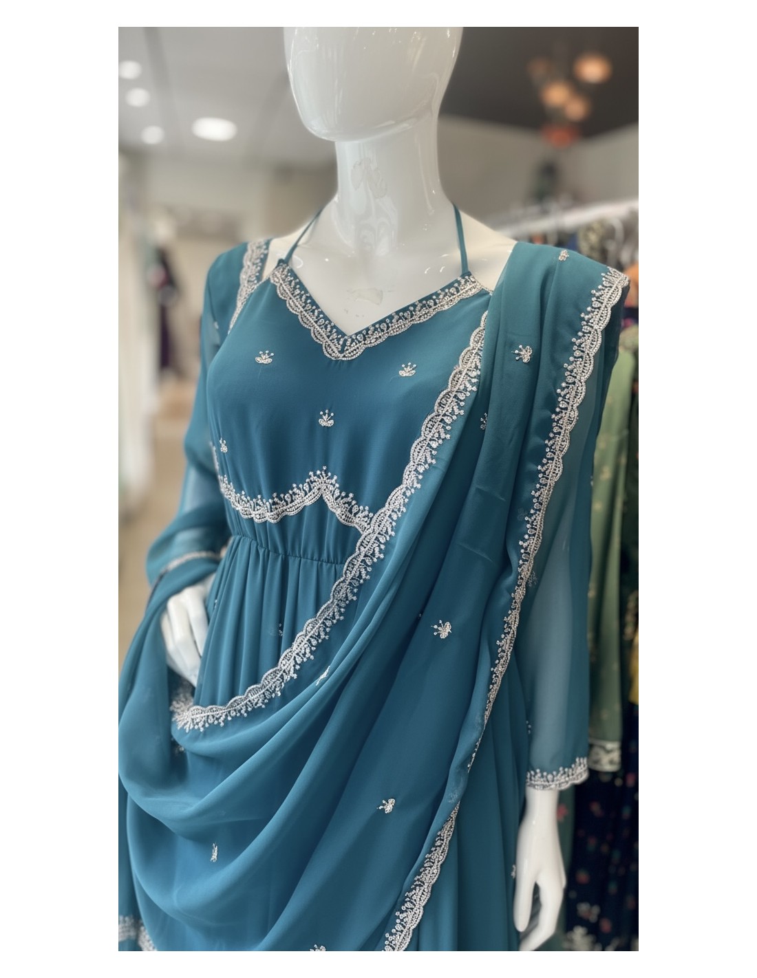 Robe Anarkali Brodée Luxe – Tenue Indienne Femme – Vert bleu  - 1