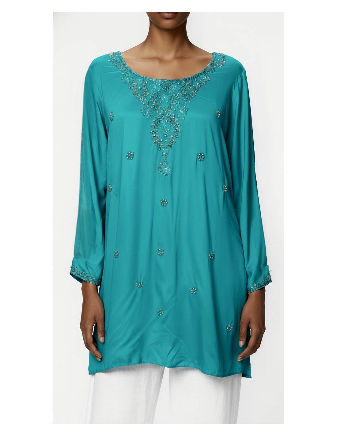 Tunique indienne brodée femme Turquoise – Kurti perlée femme – Chic, léger & confortable