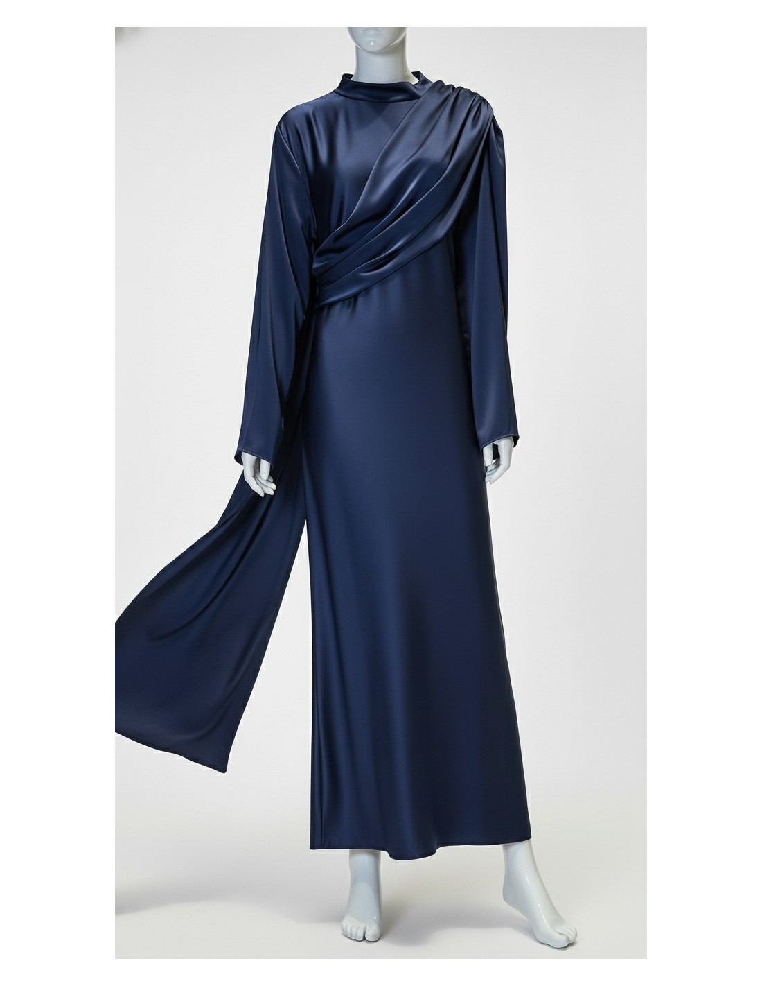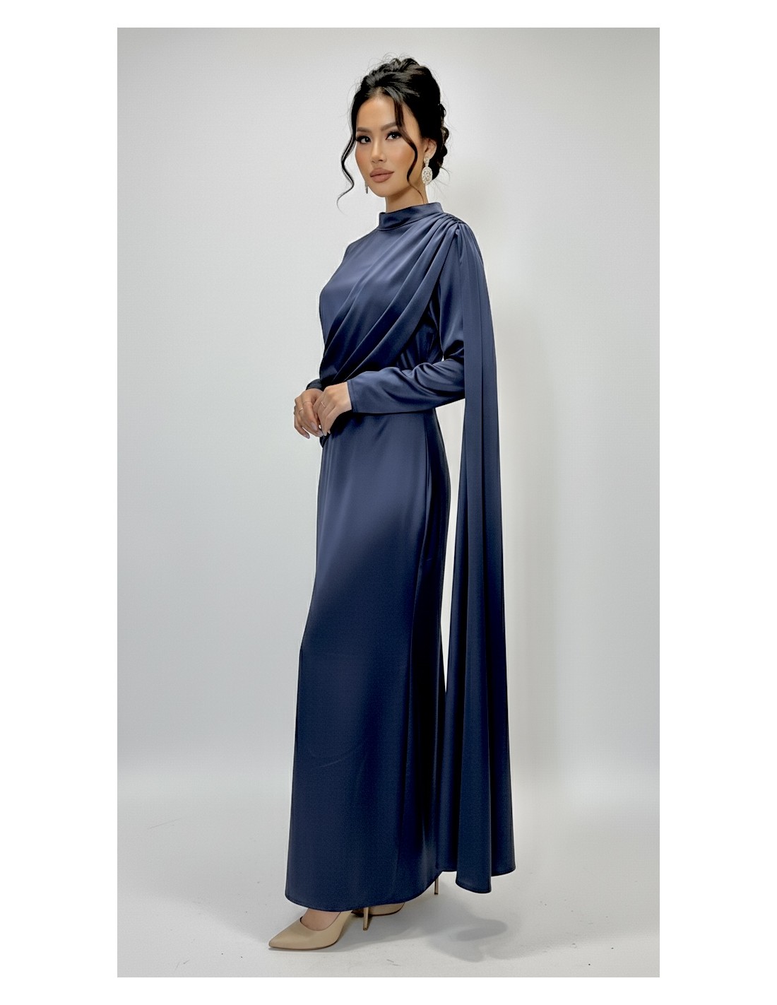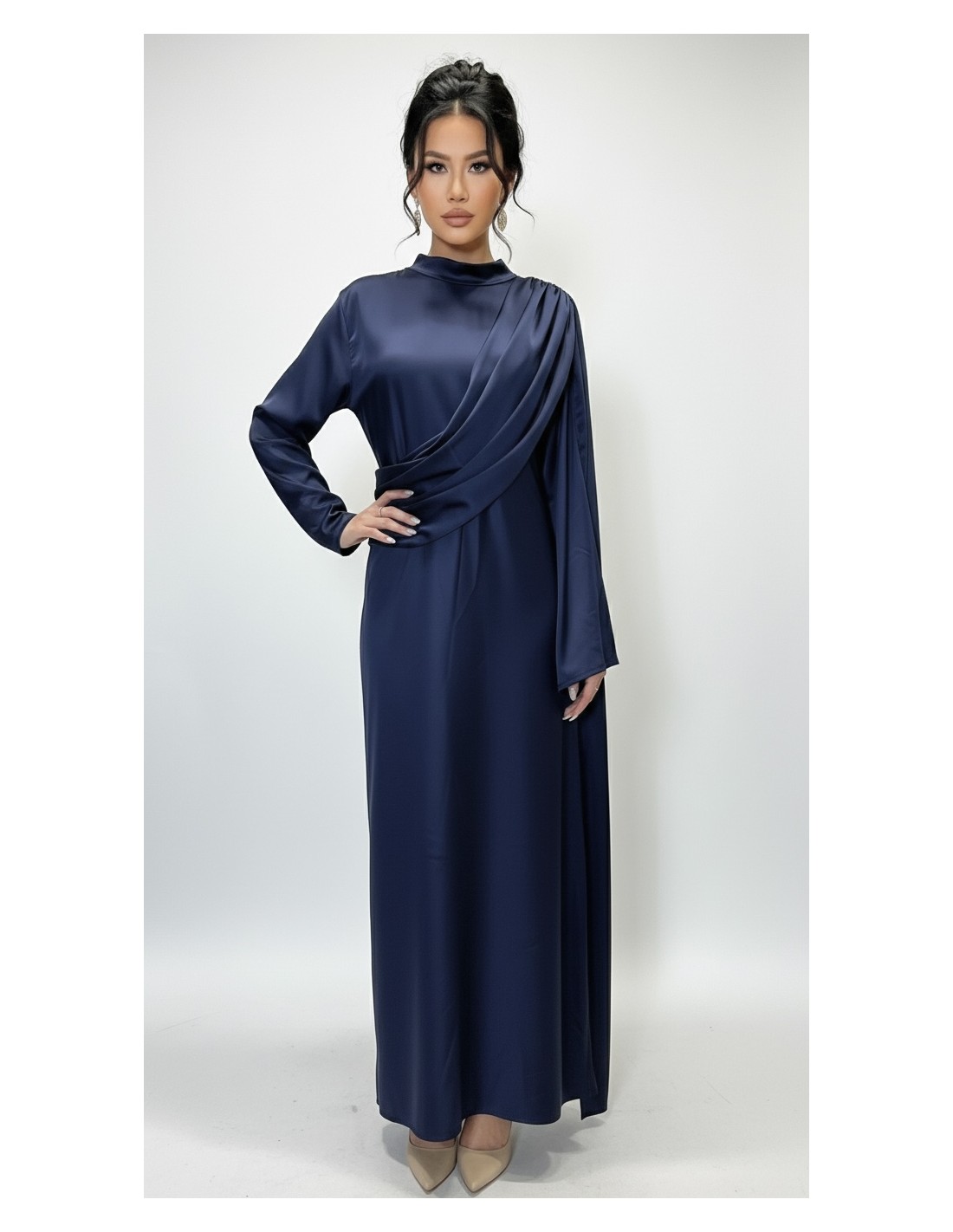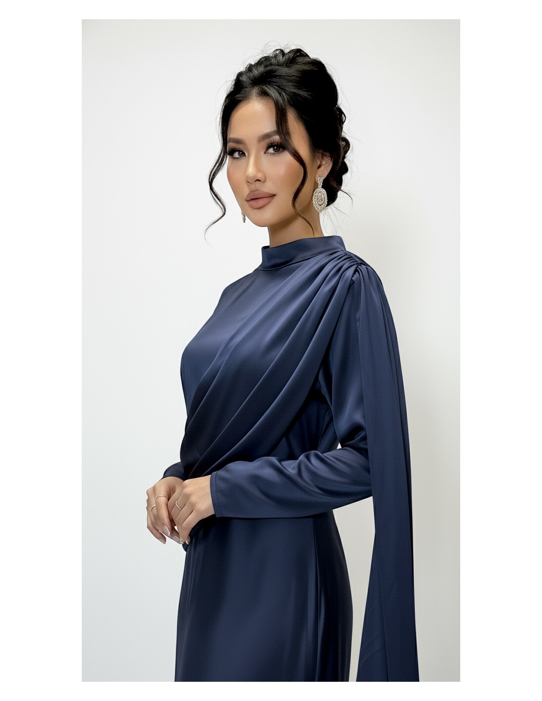 La robe se distingue par son drapé asymétrique élégant, subtilement posé sur le buste et l’épaule, apportant une touche originale et haut de gamme à la silhouette. Son col montant délicat renforce l’allure élégante et contemporaine, tandis que les manches longues fluides assurent une finition raffinée.