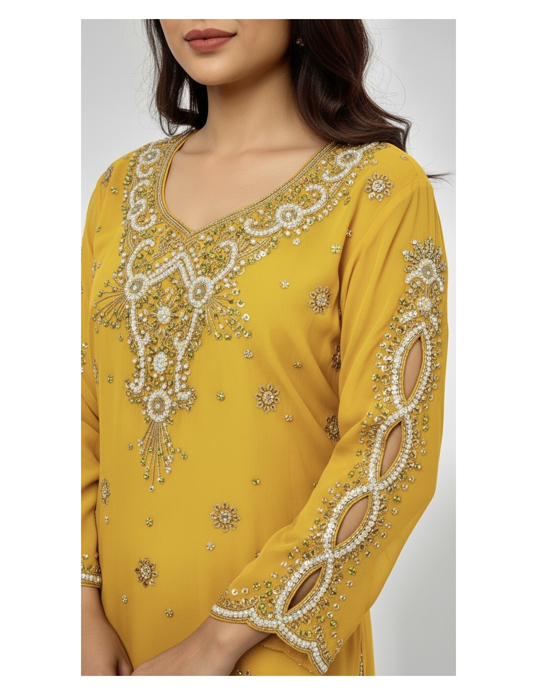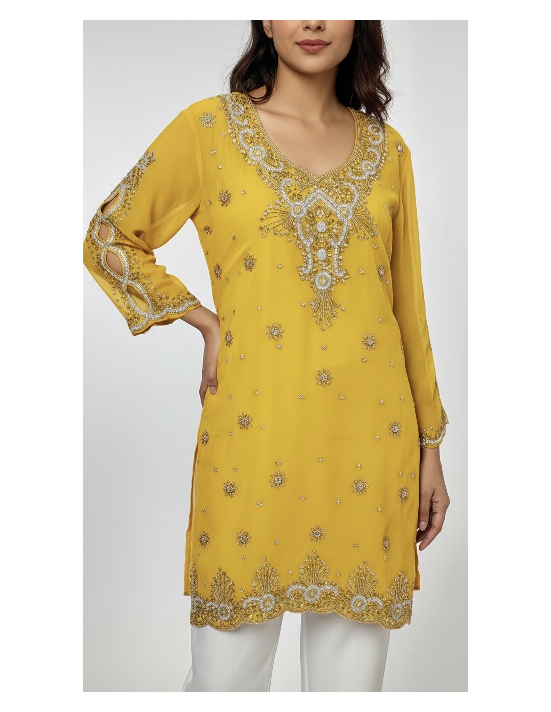 Découvrez notre magnifique Kurti indienne perée luxe, un haut oriental élégant sublimé par un travail minutieux de perles, strass et motifs traditionnels. Cette tunique longue, disponible en jaune, rose fuchsia, rouge, vert foncé et vert clair, se distingue par ses finitions raffinées et son style chic adapté à toutes les occasions : fêtes, soirées, cérémonies, mariages, événements ou simple tenue élégante du quotidien.
