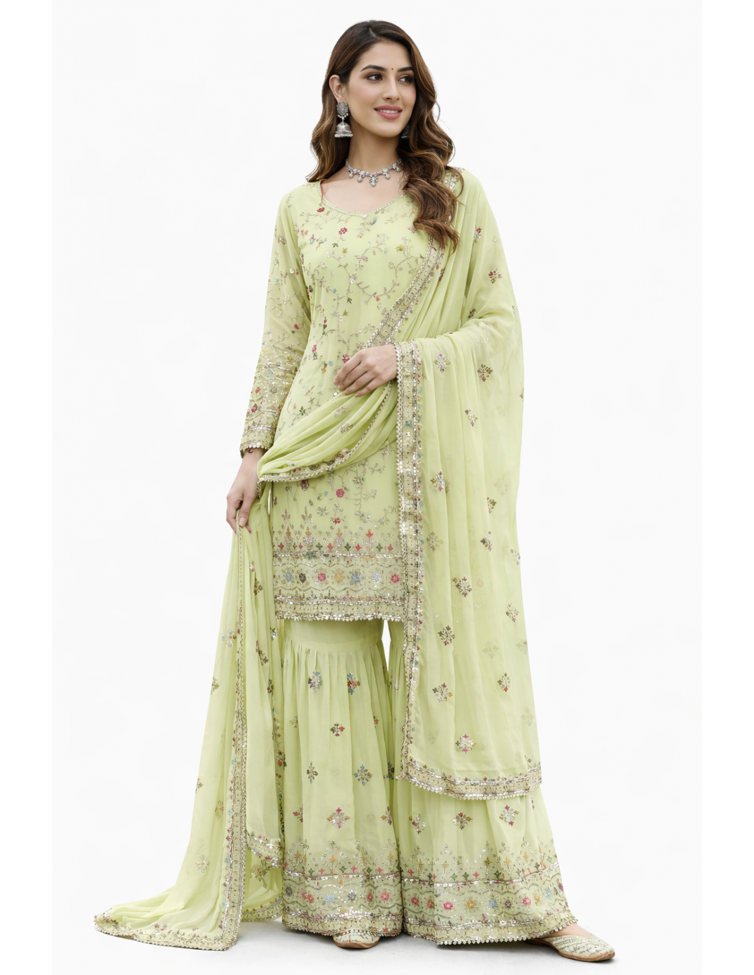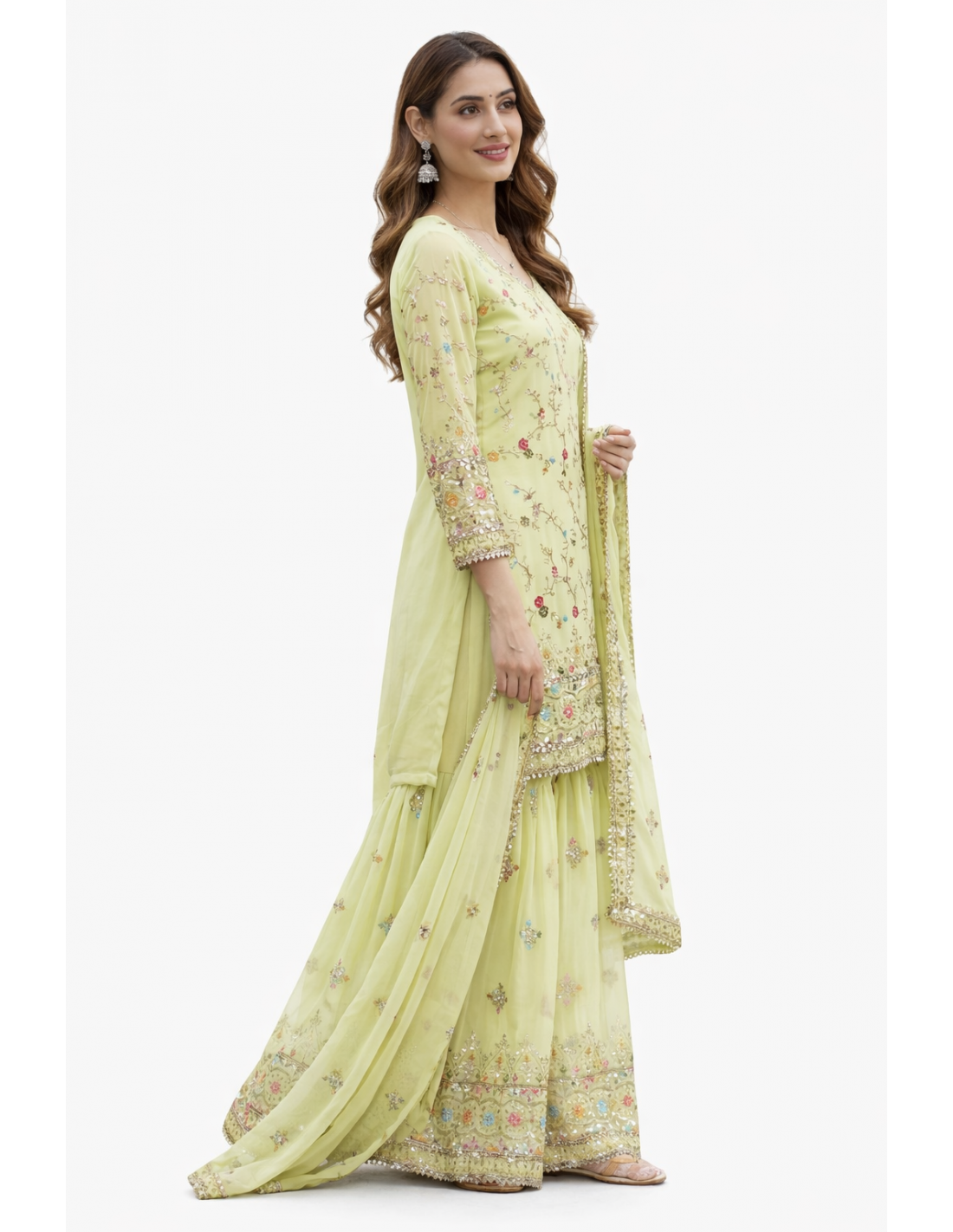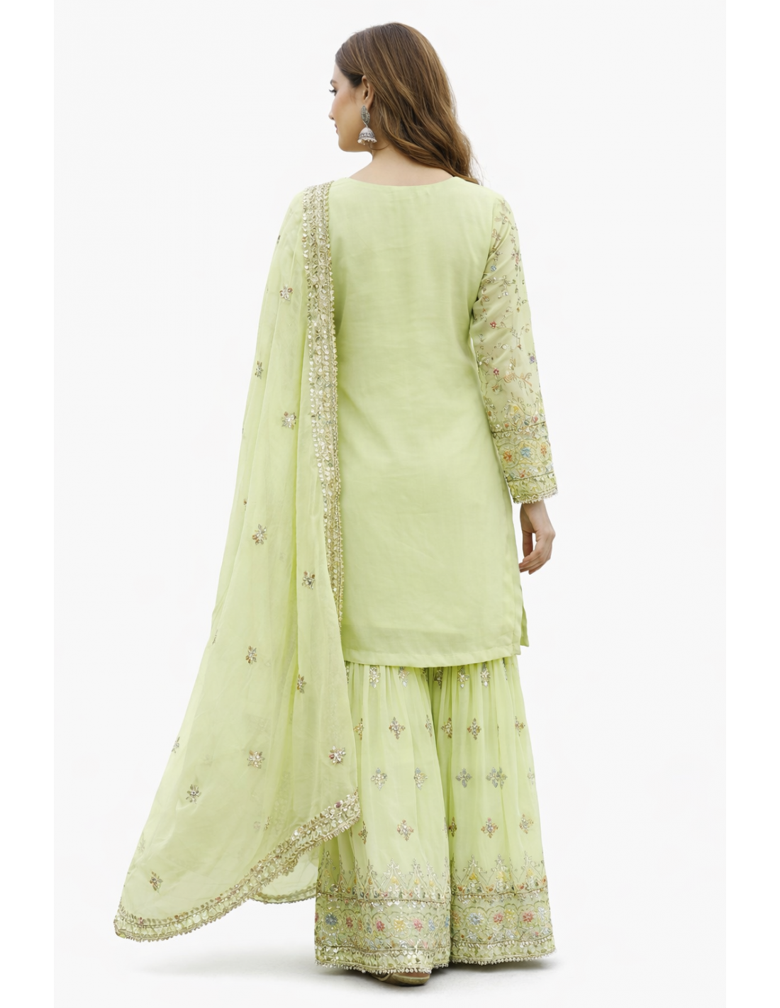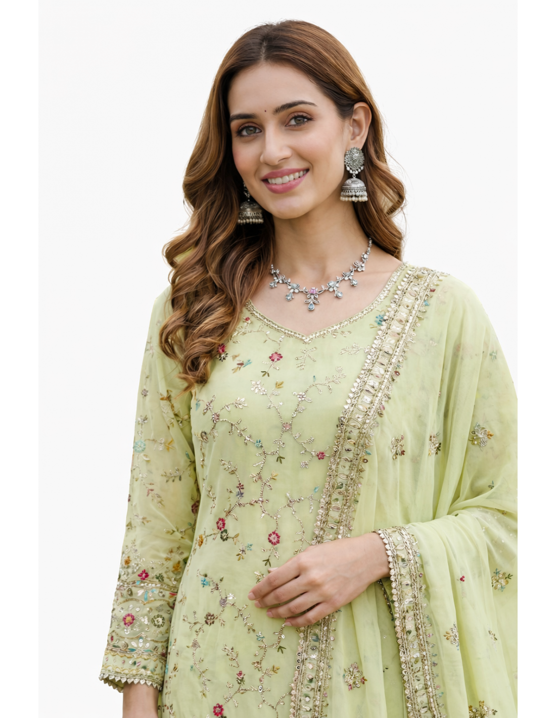 ✔️ Une tunique longue (kurta) vert pastel avec broderies florales multicolores, perles et détails raffinés
