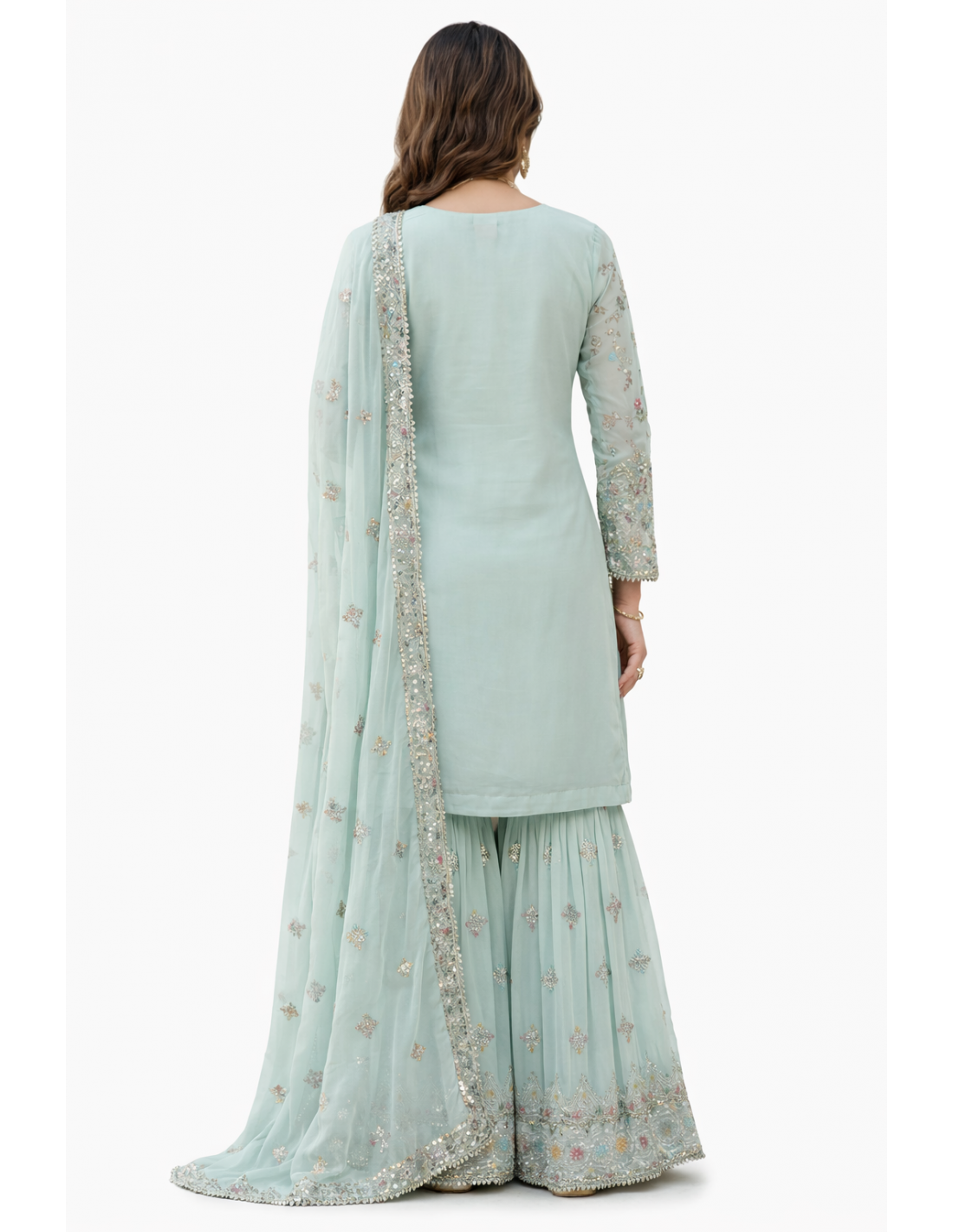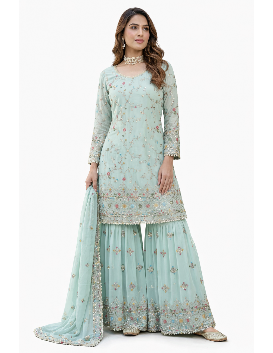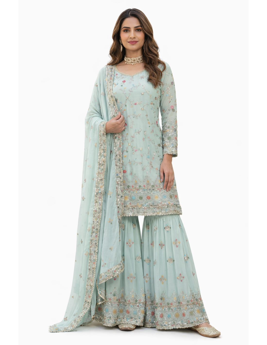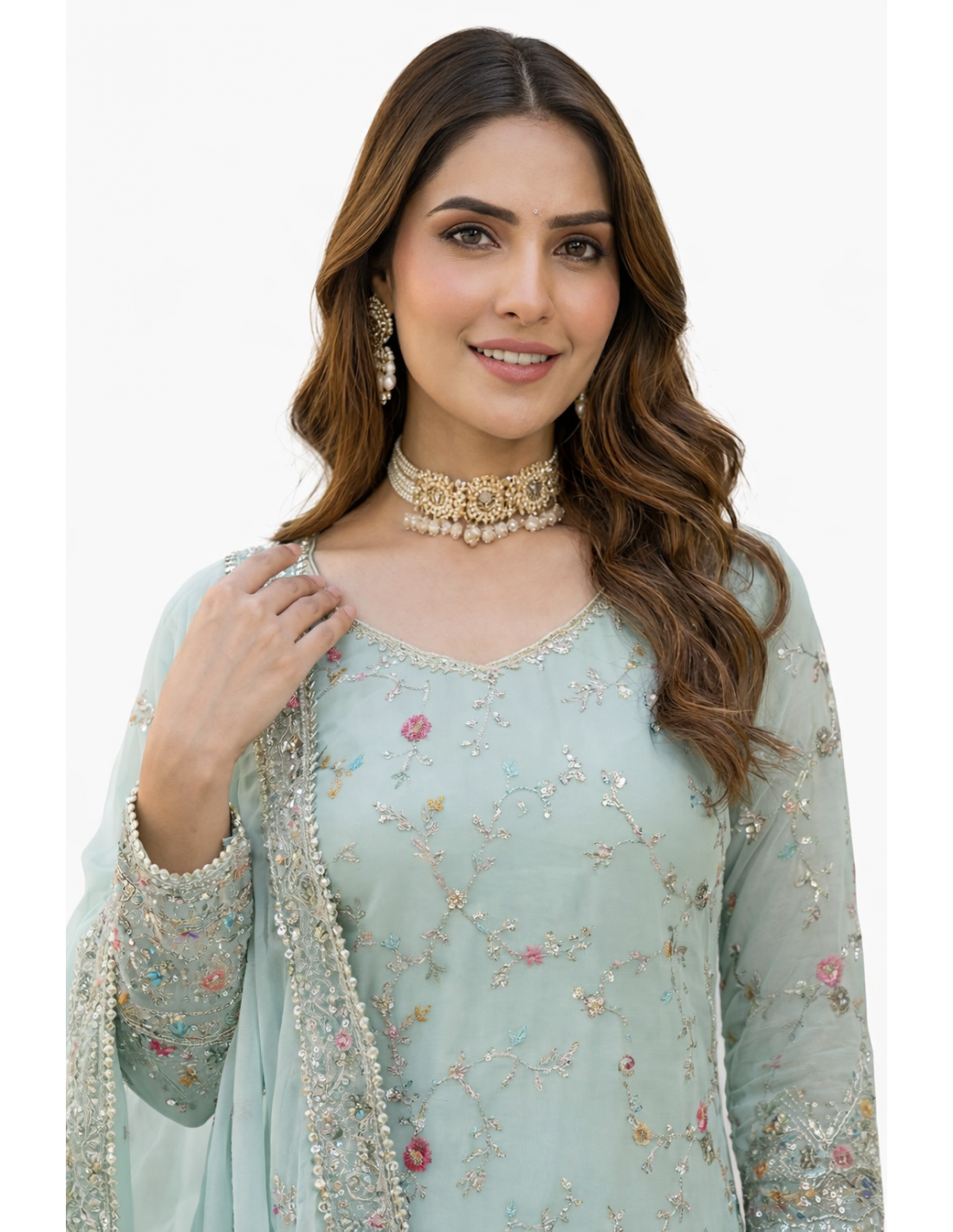 ✔️ Une tunique longue (kurta) bleu pastel avec broderies florales multicolores, perles et strass