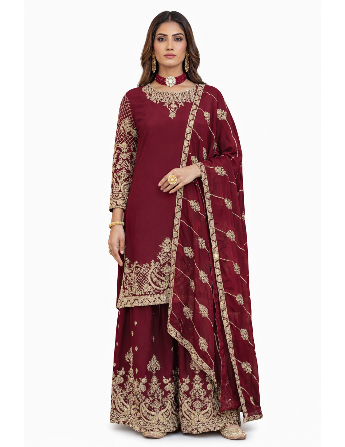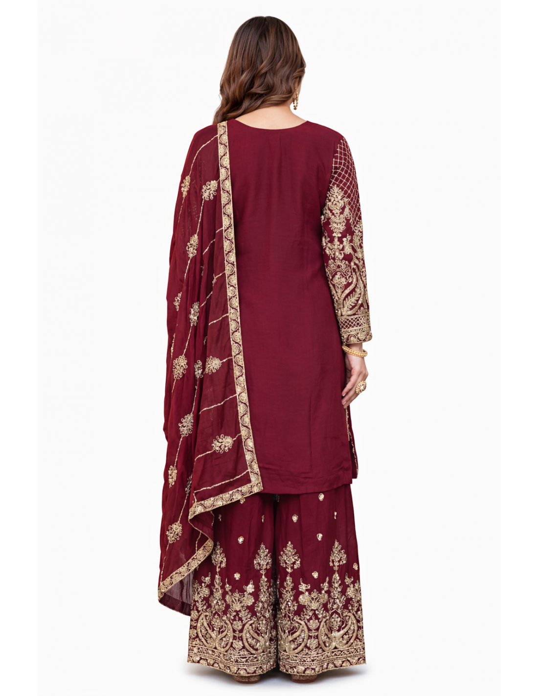 Cet ensemble 3 pièces comprend une tunique longue (kurta) bordeaux avec broderies dorées luxueuses et finitions haut de gamme, un pantalon palazzo fluide assorti avec motifs brodés au bas, ainsi qu’un dupatta en mousseline élégant avec bordures brodées dorées. La coupe moderne et la matière légère assurent un tombé parfait et un confort optimal toute la journée.