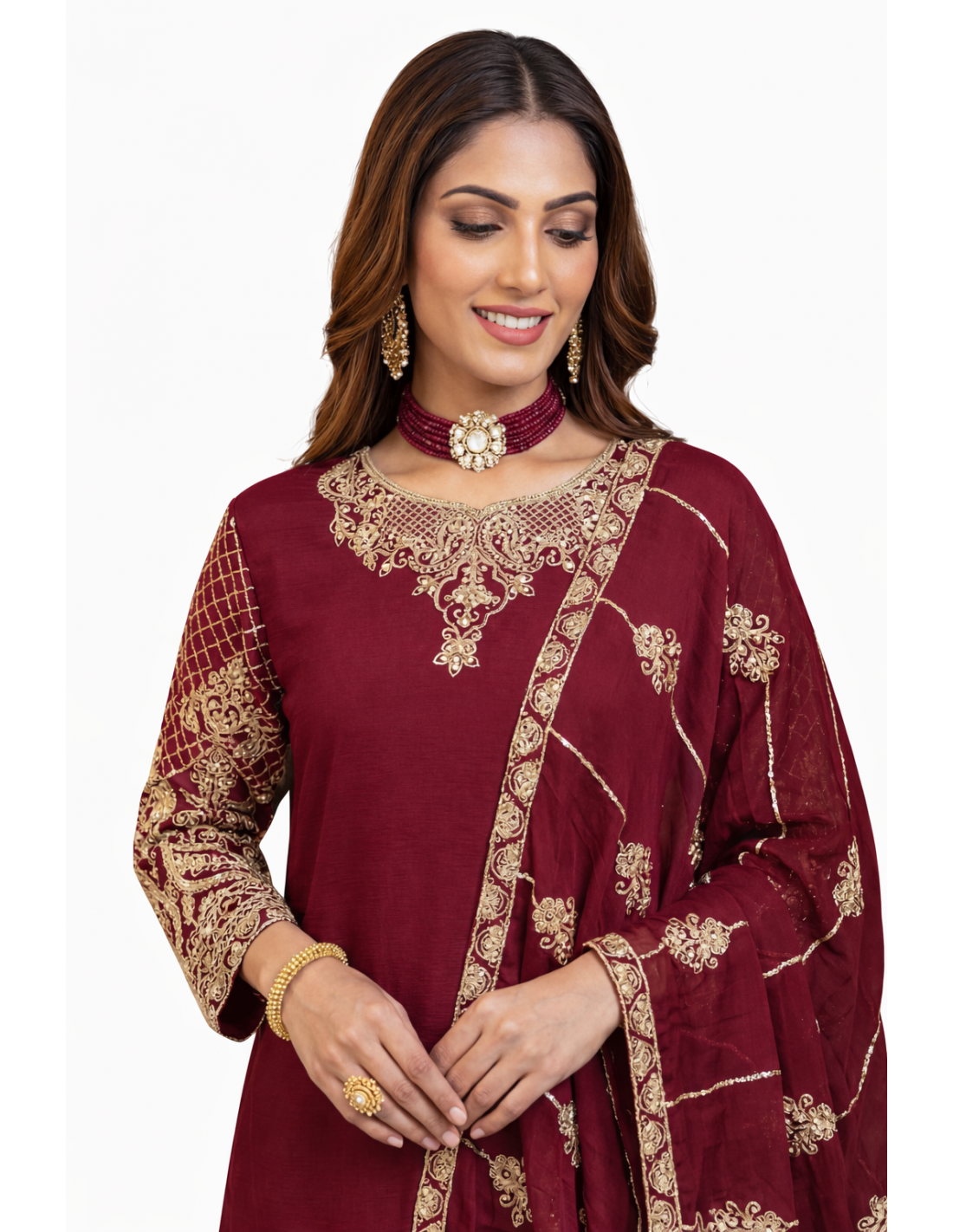 Couleur bordeaux intense et tendance. Broderies dorées riches et raffinées. Style indien, pakistanais et oriental. Coupe féminine et moderne. Idéal pour Ramadan, Aïd, mariage, soirée et fêtes. Tissu fluide et agréable à porter. Look chic et haut de gamme. Facile à accessoiriser avec bijoux dorés.