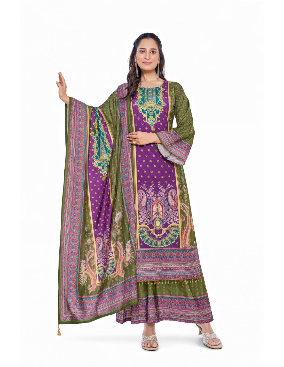 Craquez pour cette magnifique tenue pakistanaise élégante et tendance, idéale pour vos événements, soirées, Ramadan, Aïd, mariages ou fêtes orientales. Ce superbe ensemble 3 pièces Salwar Kameez séduit par son imprimé riche et ses motifs traditionnels aux couleurs vibrantes mêlant mauve, violet, vert et doré pour un style à la fois moderne et authentique.