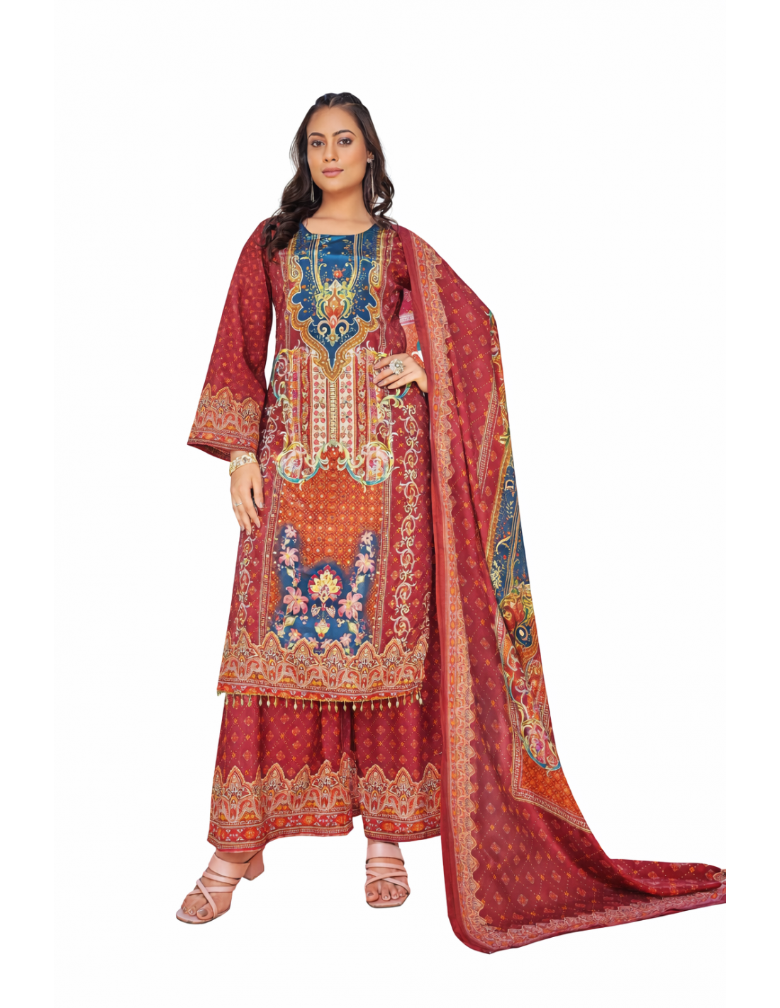 La tunique longue présente de sublimes détails imprimés d’inspiration indo-pakistanaise avec un travail visuel raffiné au niveau du col et du bas, apportant une touche chic et sophistiquée. Le pantalon large assorti assure confort et élégance, tandis que le dupatta fluide complète parfaitement la tenue pour une silhouette féminine et harmonieuse.