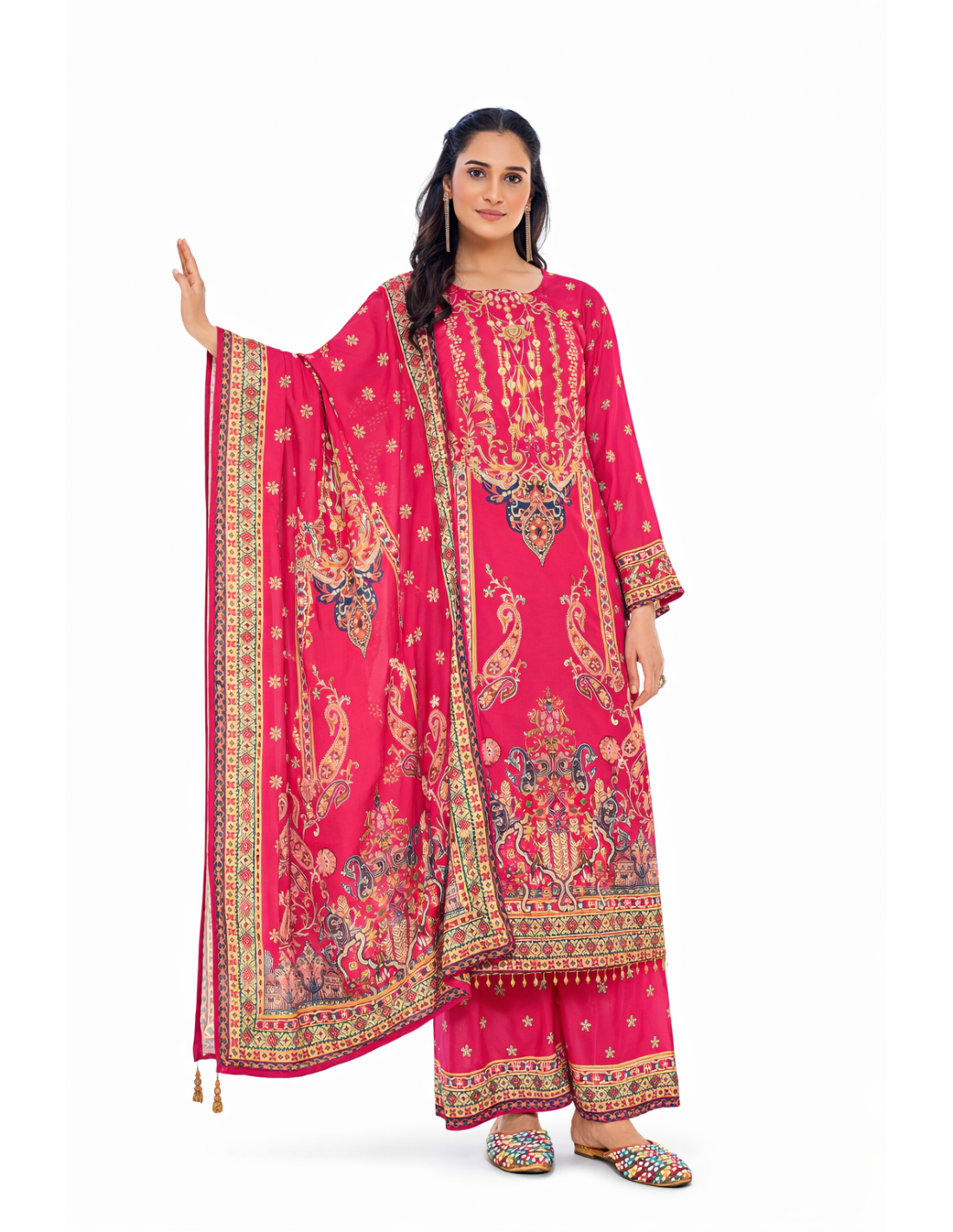 Craquez pour cette magnifique tenue pakistanaise élégante et tendance, idéale pour vos événements, soirées, Ramadan, Aïd, mariages ou fêtes orientales. Ce superbe ensemble 3 pièces Salwar Kameez séduit par son imprimé riche et ses motifs traditionnels aux couleurs vibrantes mêlant mauve, violet, vert et doré pour un style à la fois moderne et authentique.