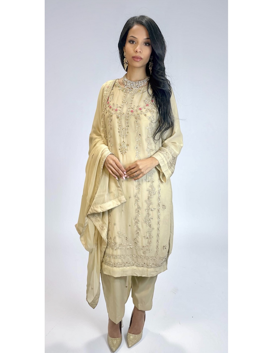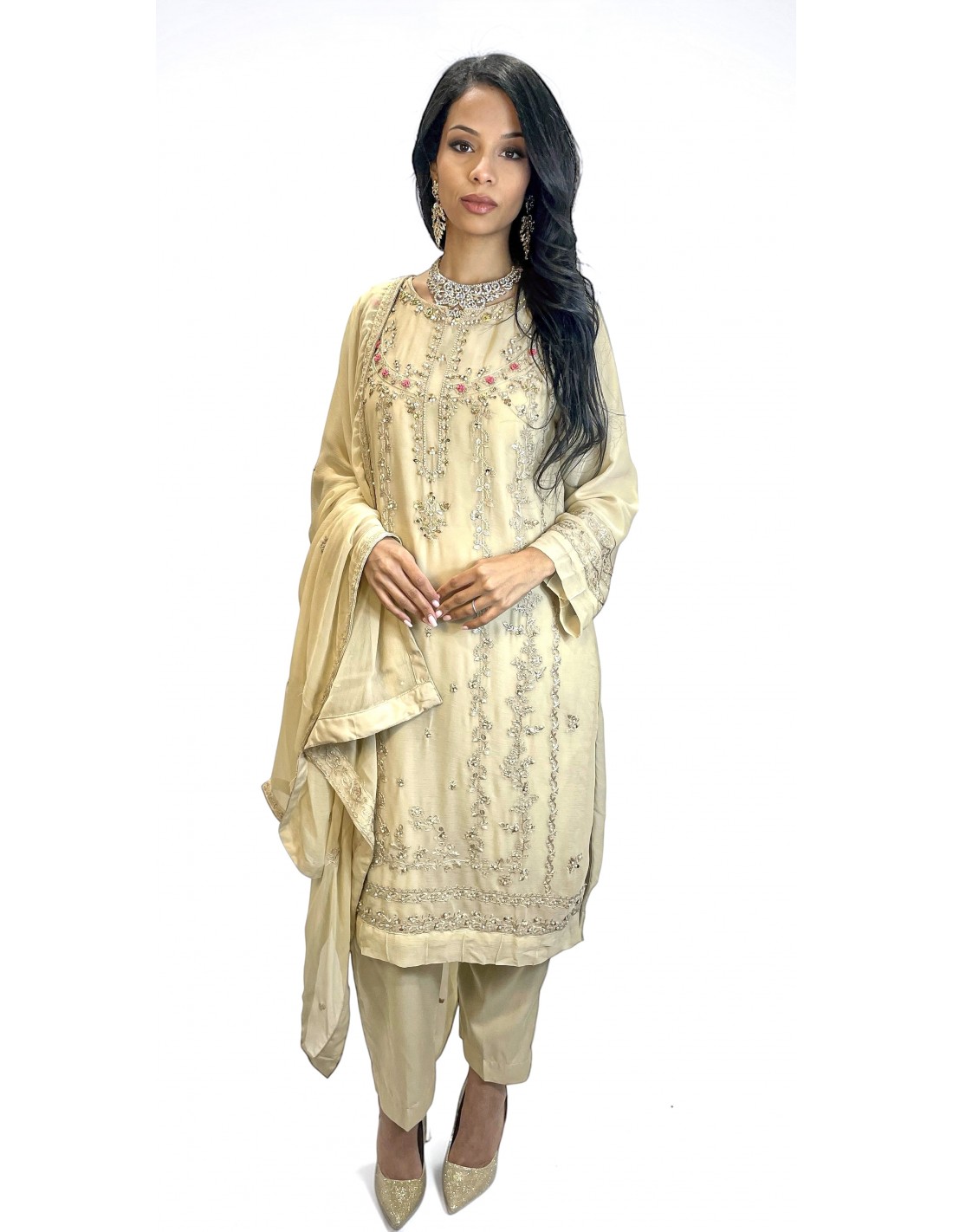 Tenue Pakistanaise Femme Luxe Brodée main–beige/broderies rose  - 1