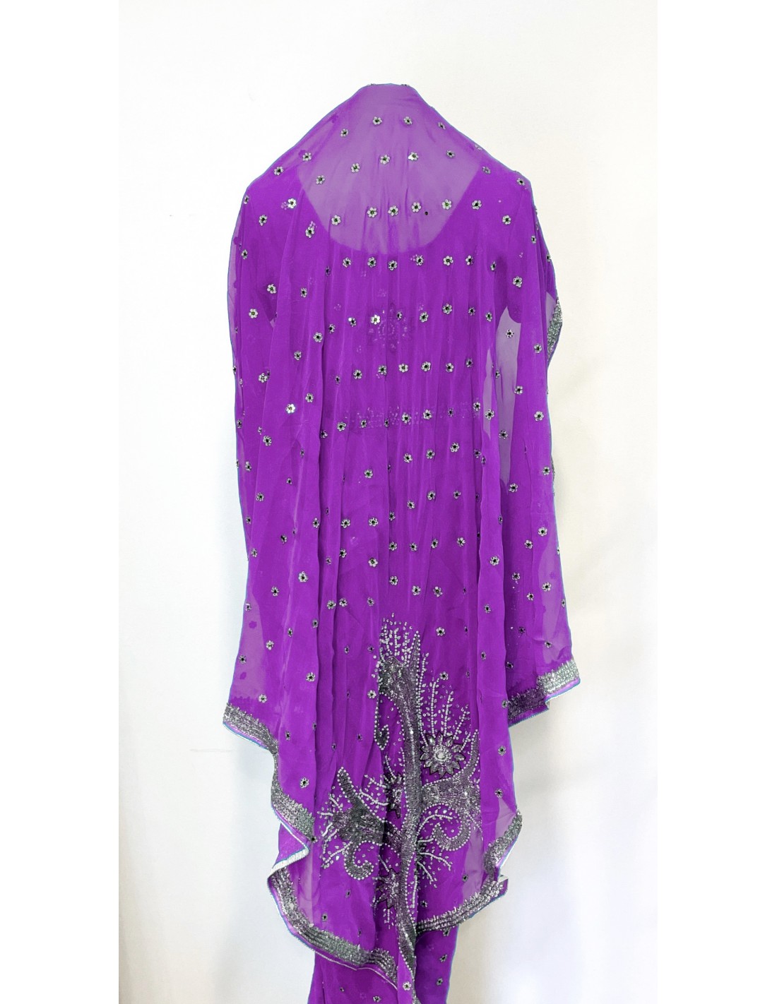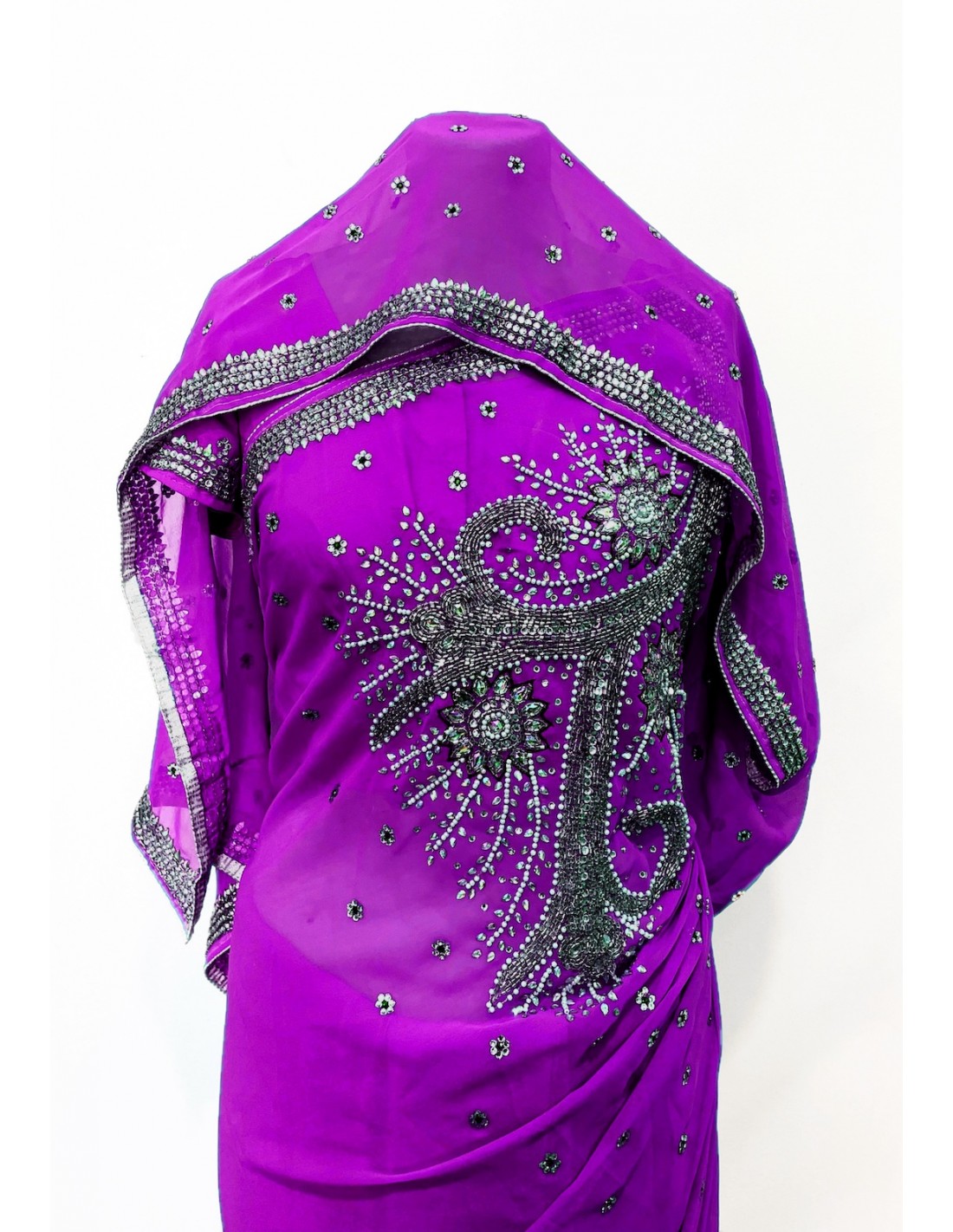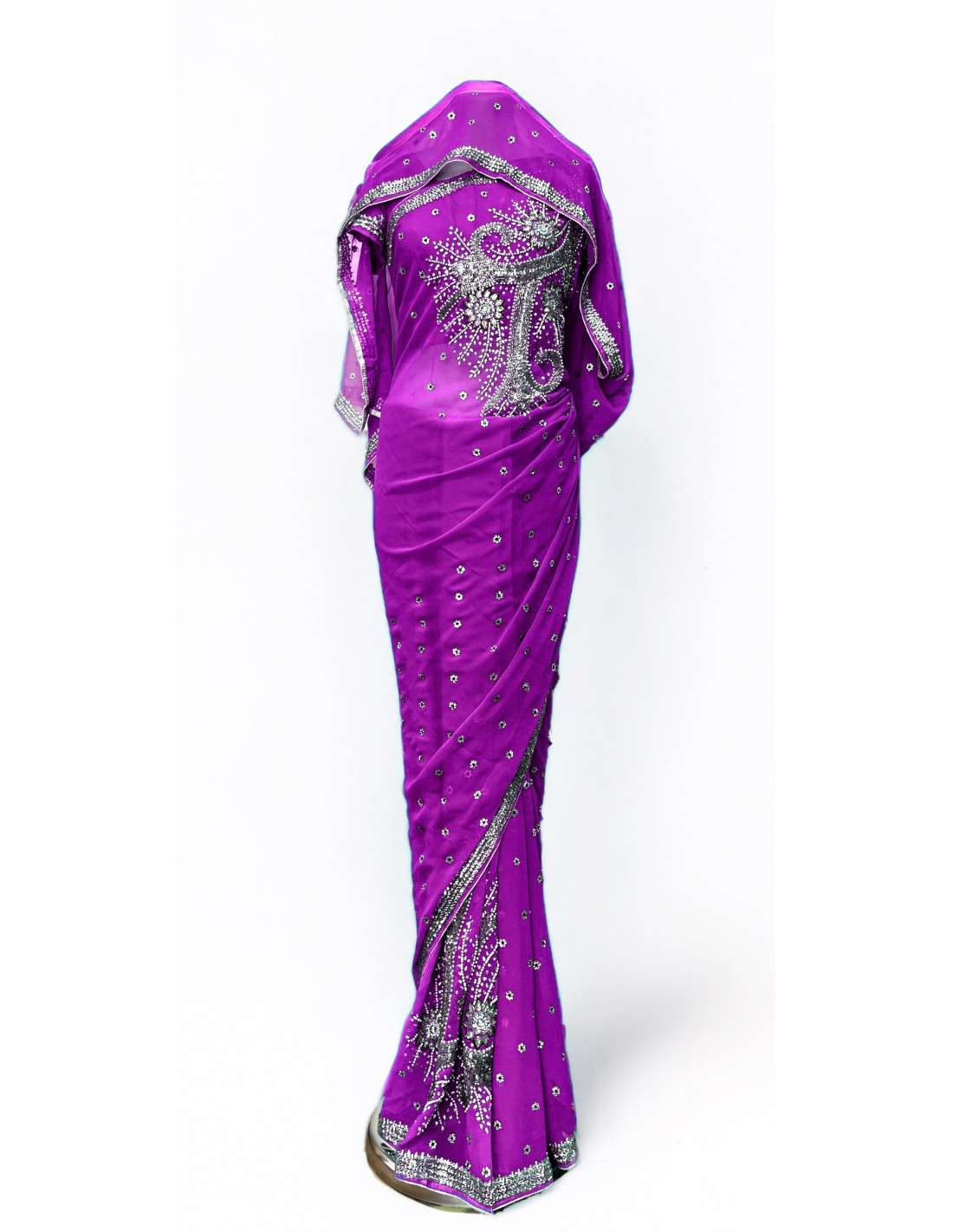 Sari prune/violet sertie de pierre argenté et strass sur le top, et le tissu.
