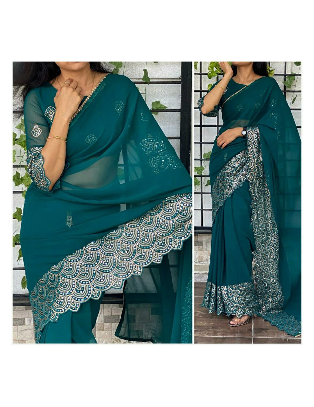 Sari en voilage type mousseline, sertie de strass dorés, avec son petit haut manches courtes, assortie. liseré brodé dentelle vert paon