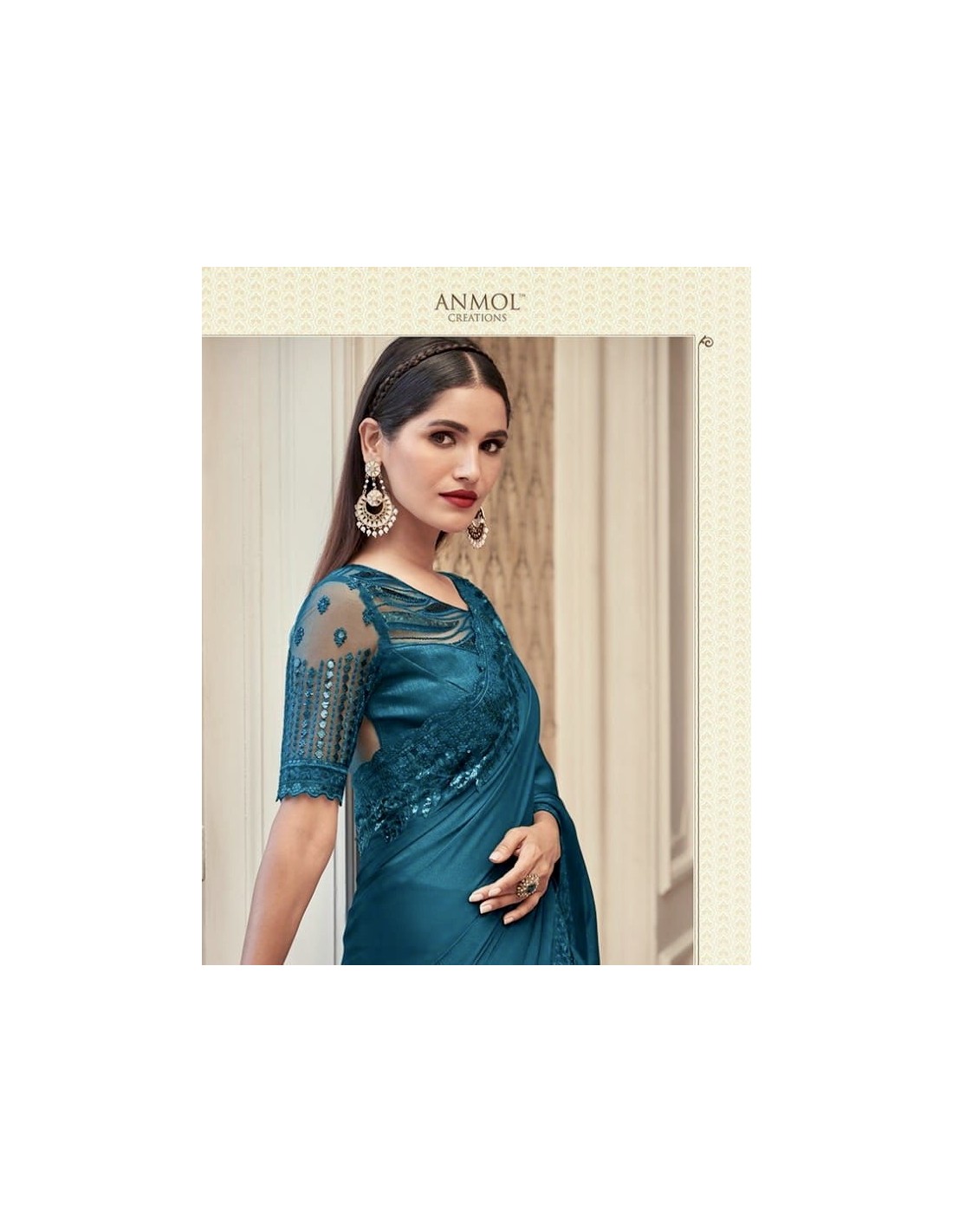 Sari indien Anmol prêt à porter Bleu paon  - 1