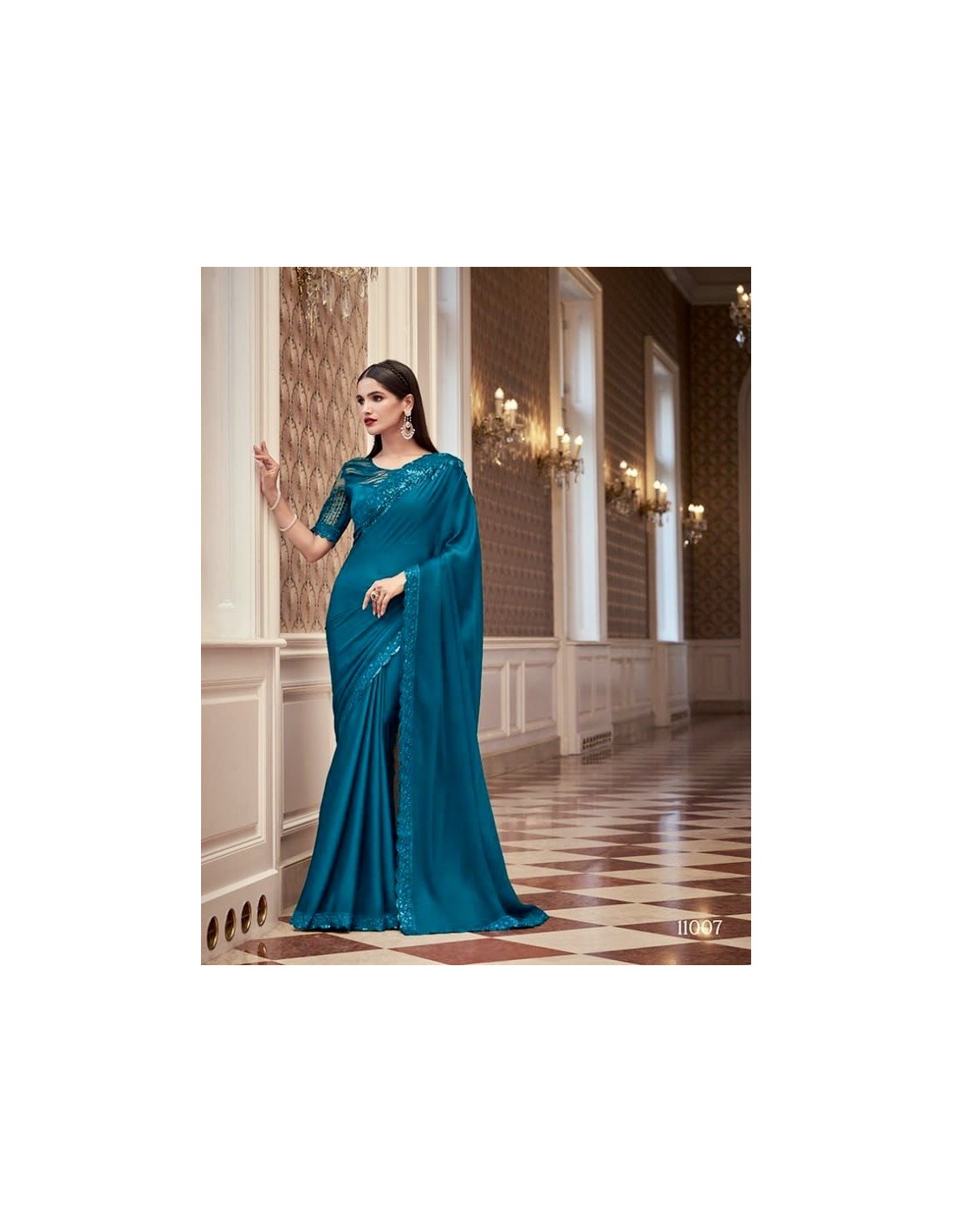 Sari en mousseline satinée, brodé d'un large liseré sequins bleu