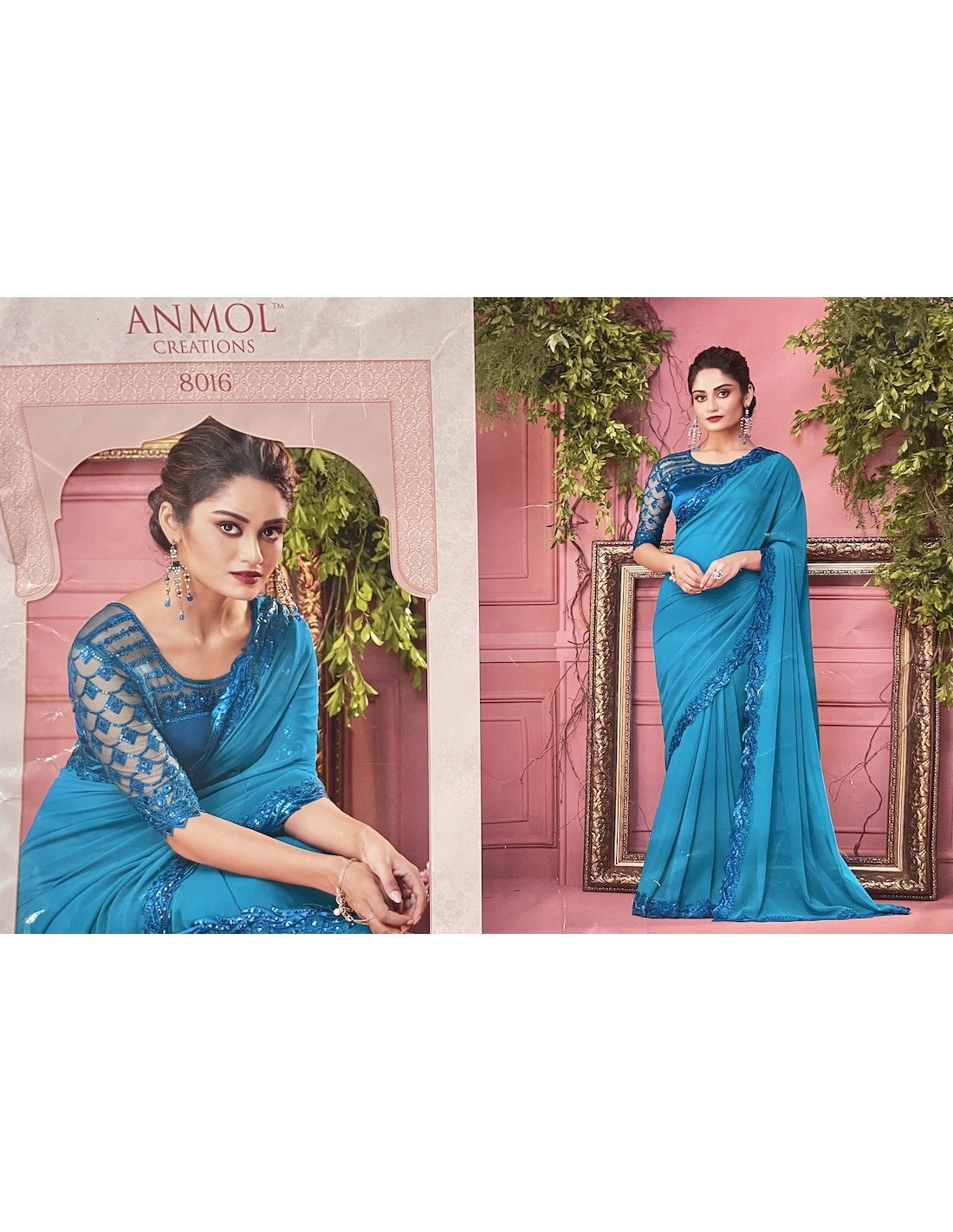 Sari en tissu Georgette légère, brodé d'un large liseré sequins bleu
