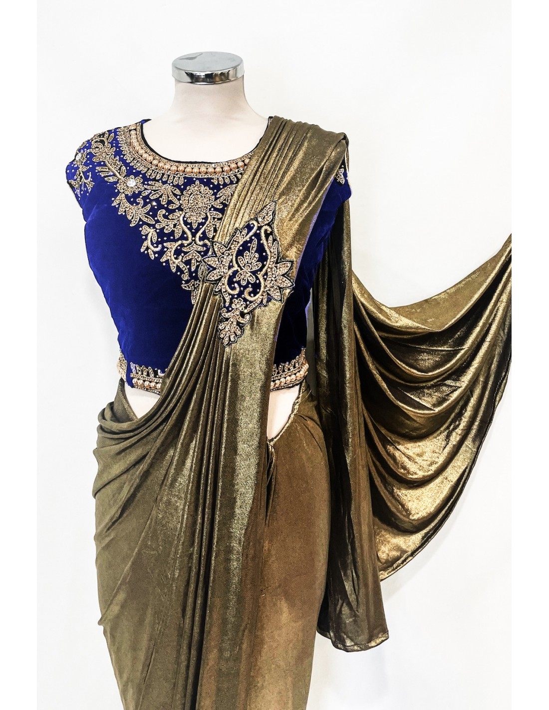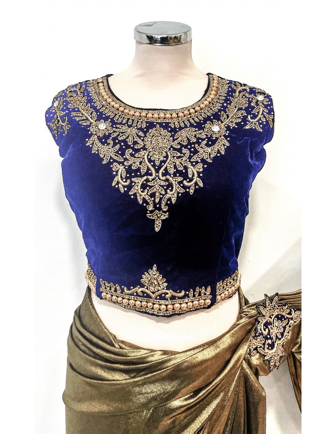 magnifique sari en Lycra doré, avec son top en velours bleu nuit (couleur légèrement plus foncé en vrai), decoré de strass et pierres doré