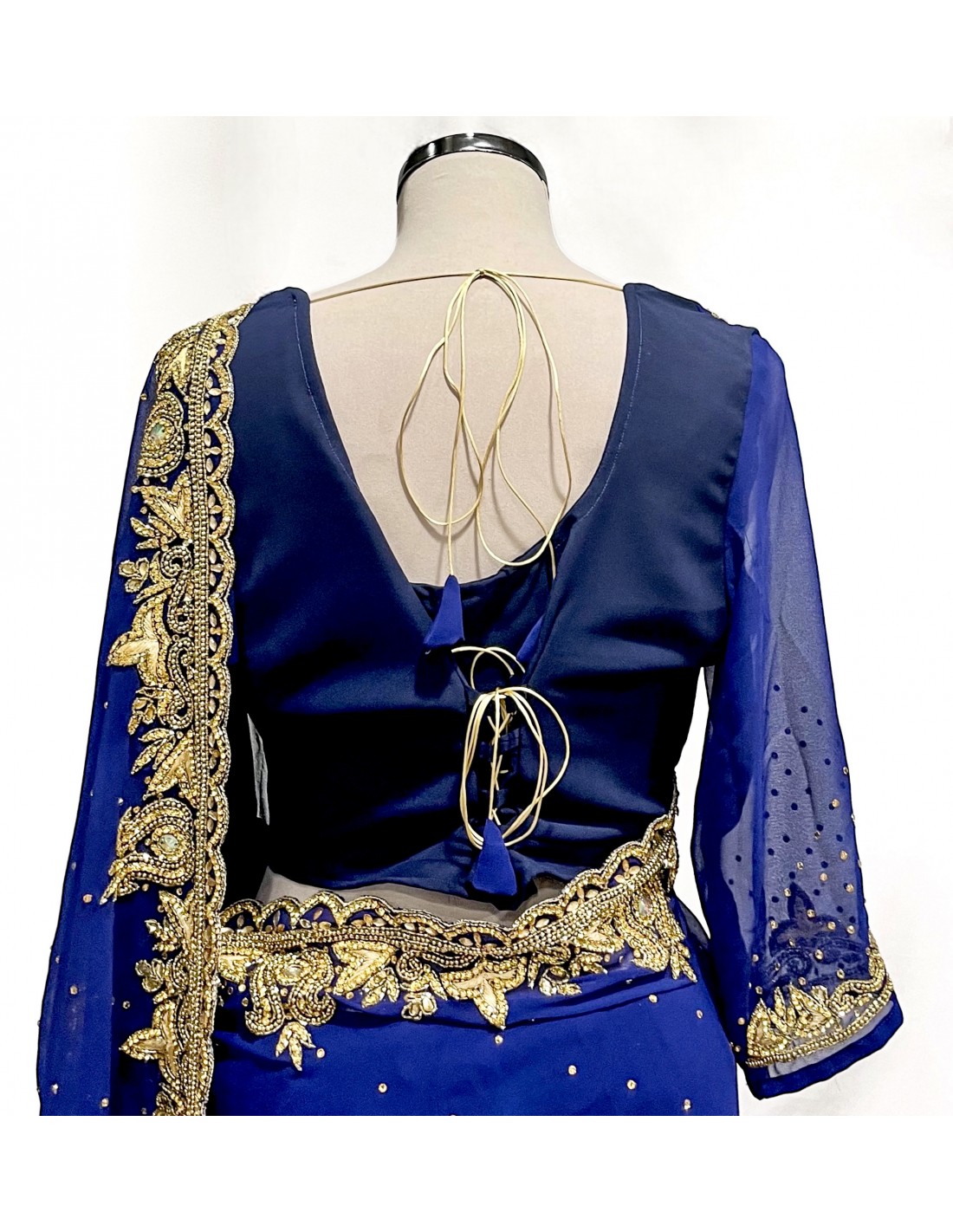 Le sari indien est vendu avec le haut cousu, mais le bas se porte de manière traditionnelle, en enroulant autour de taille et en effectuant les plis;